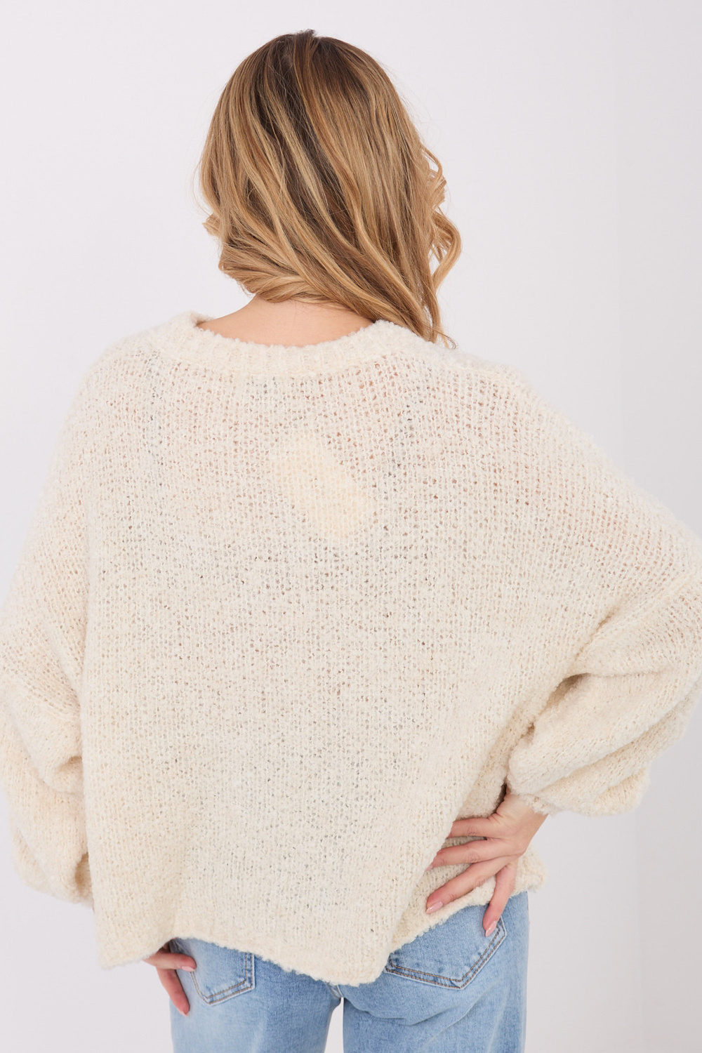 Rozměry svetru jedné velikosti: šířka pod paží – 68 cm, šířka přes boky – 51 cm, délka rukávu – 50 cm, celková délka – 57 cm.