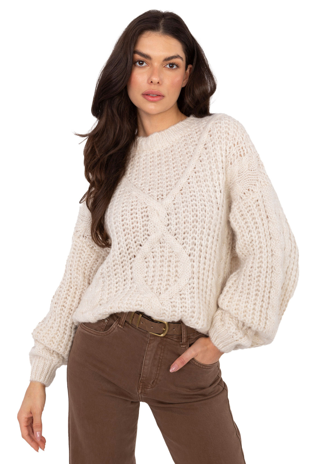 Rozměry svetru jedné velikosti: šířka podpaží – 64 cm, celková délka – 63 cm, délka rukávu – 57 cm (od švu), šířka boků – 43 cm.