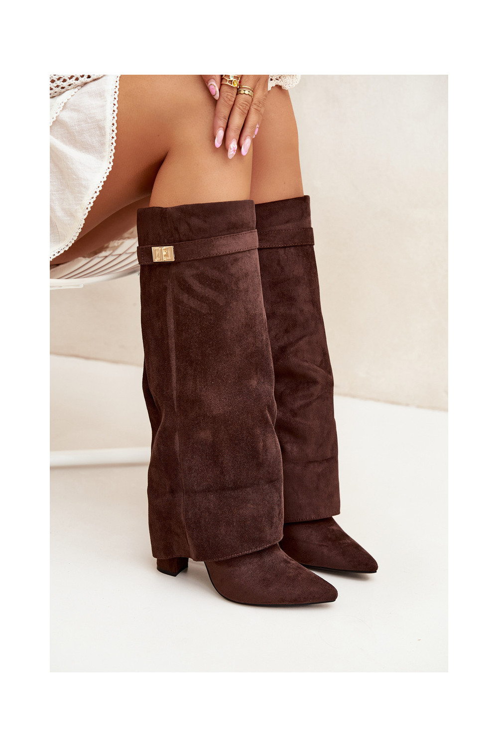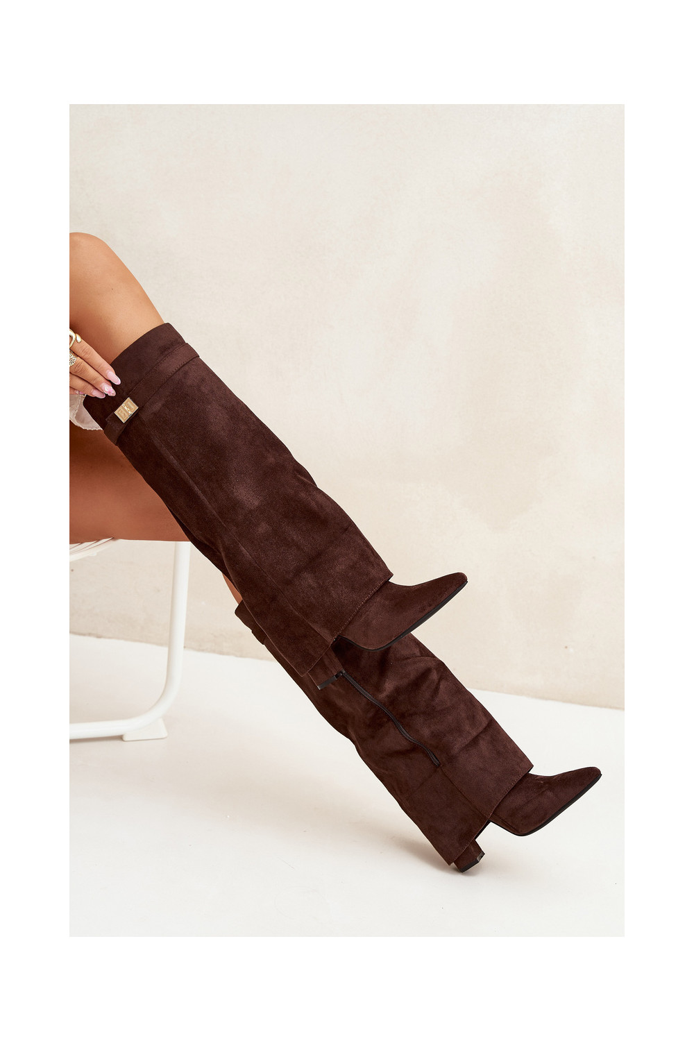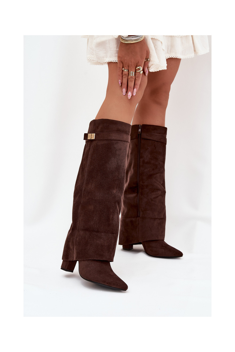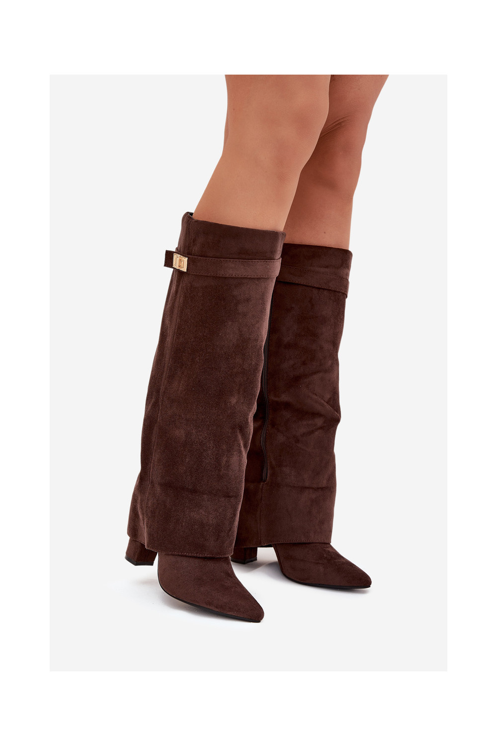 dlouhé boty z eko semišeowe Obcas Słupek zateplené Wywinięta Cholewka Czekoladowe Evyra
