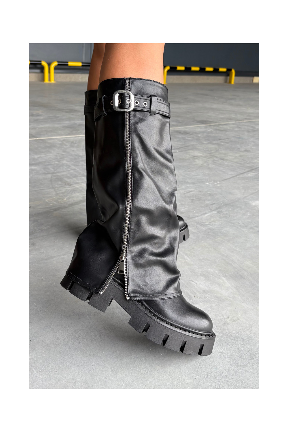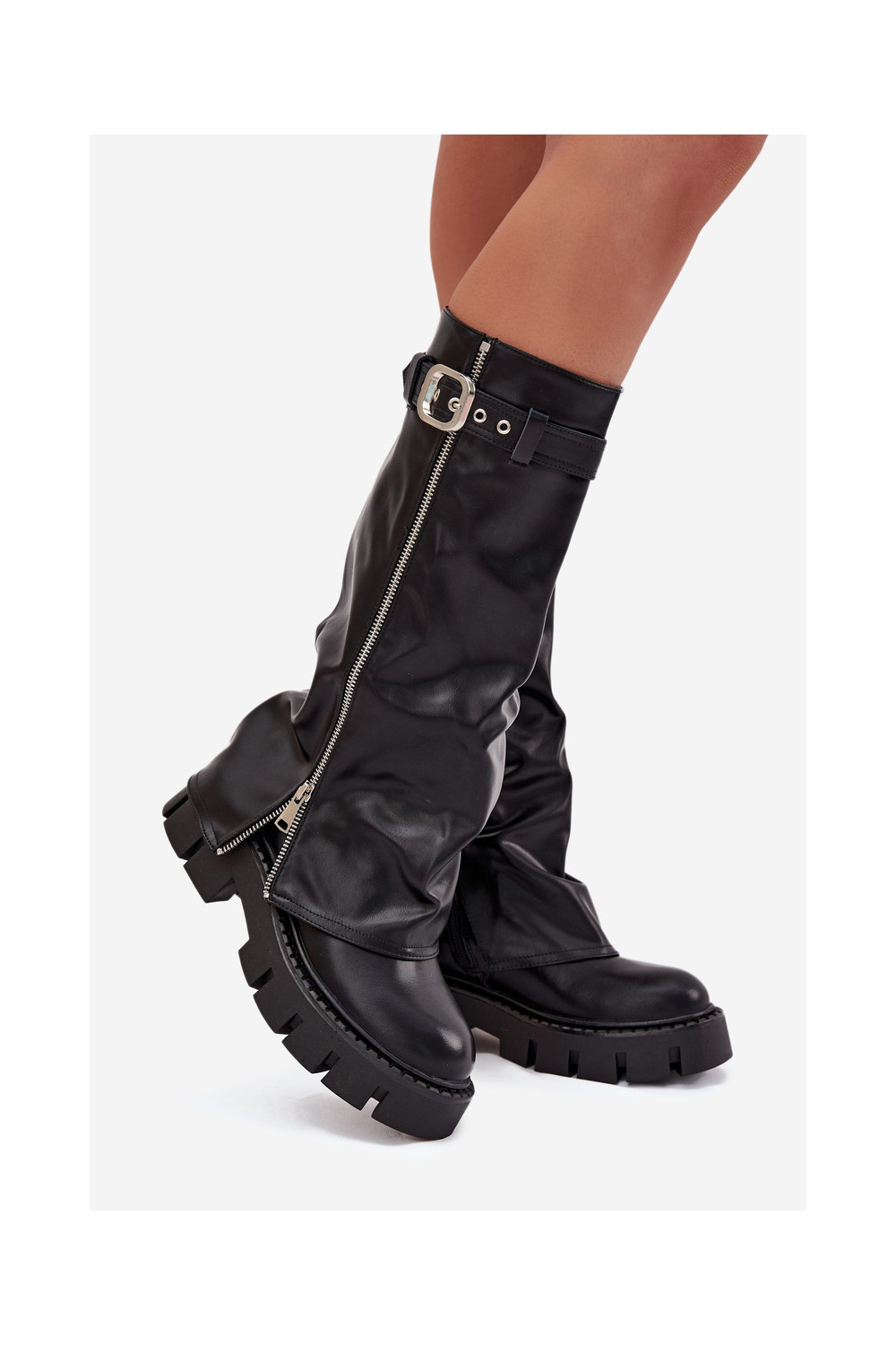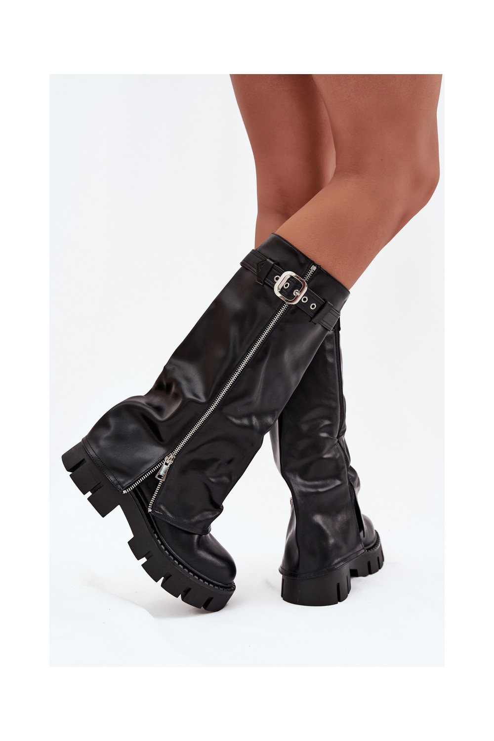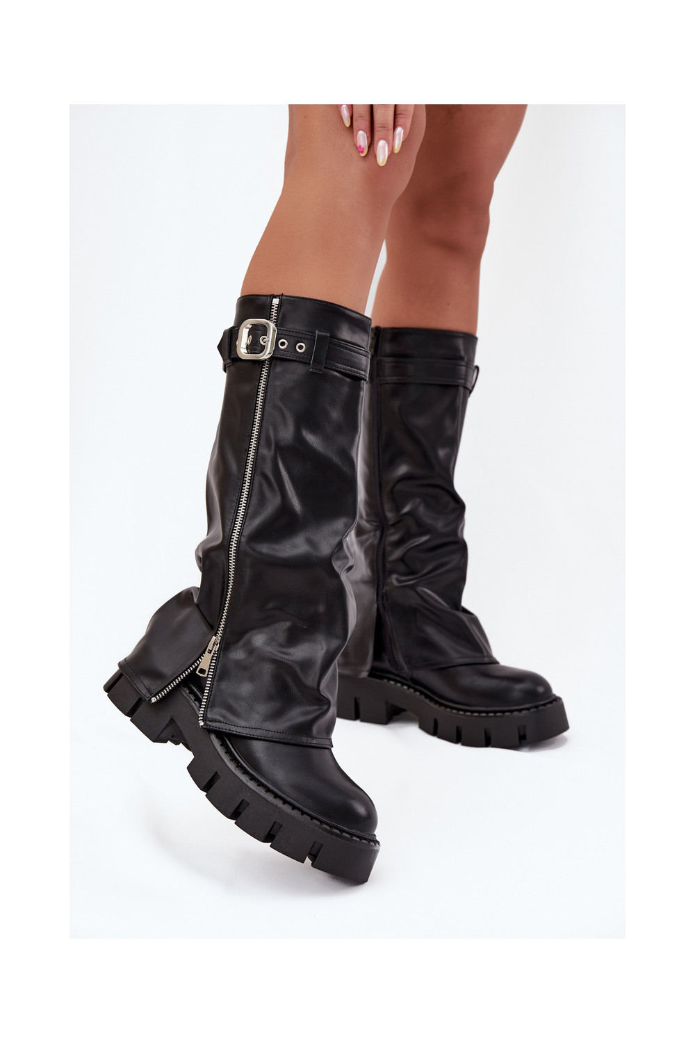 zateplené dlouhé boty Z Wywiniętą Cholewką s přezkami I stříbrné barvym Zamkiem Černé Armena