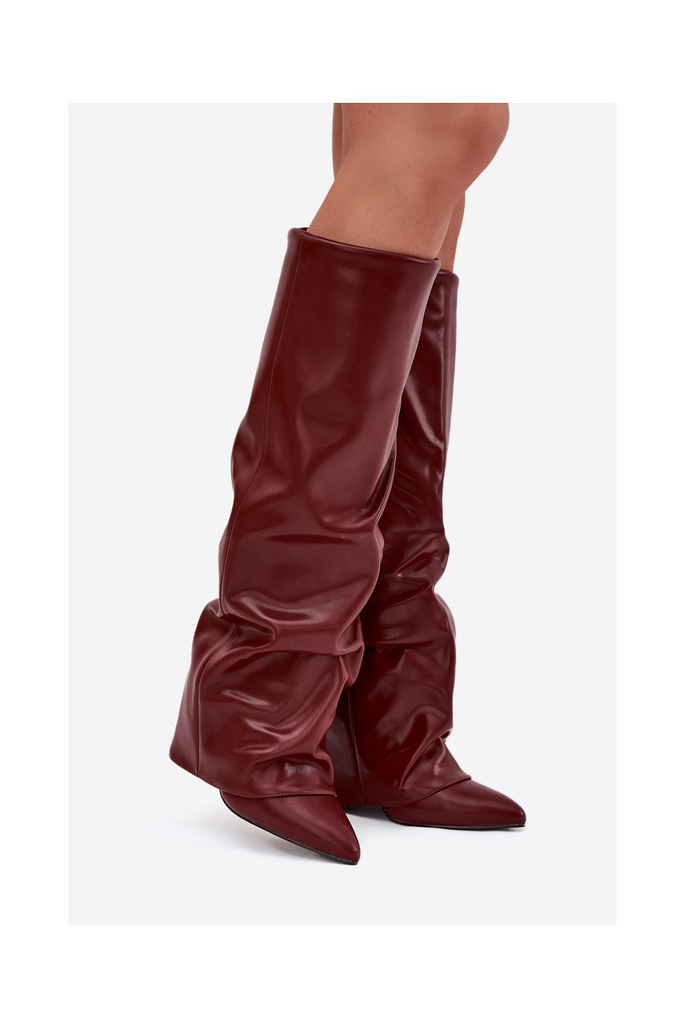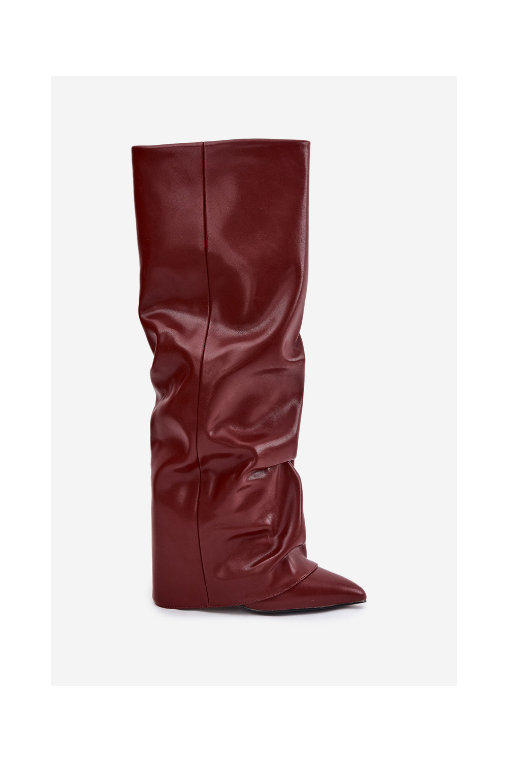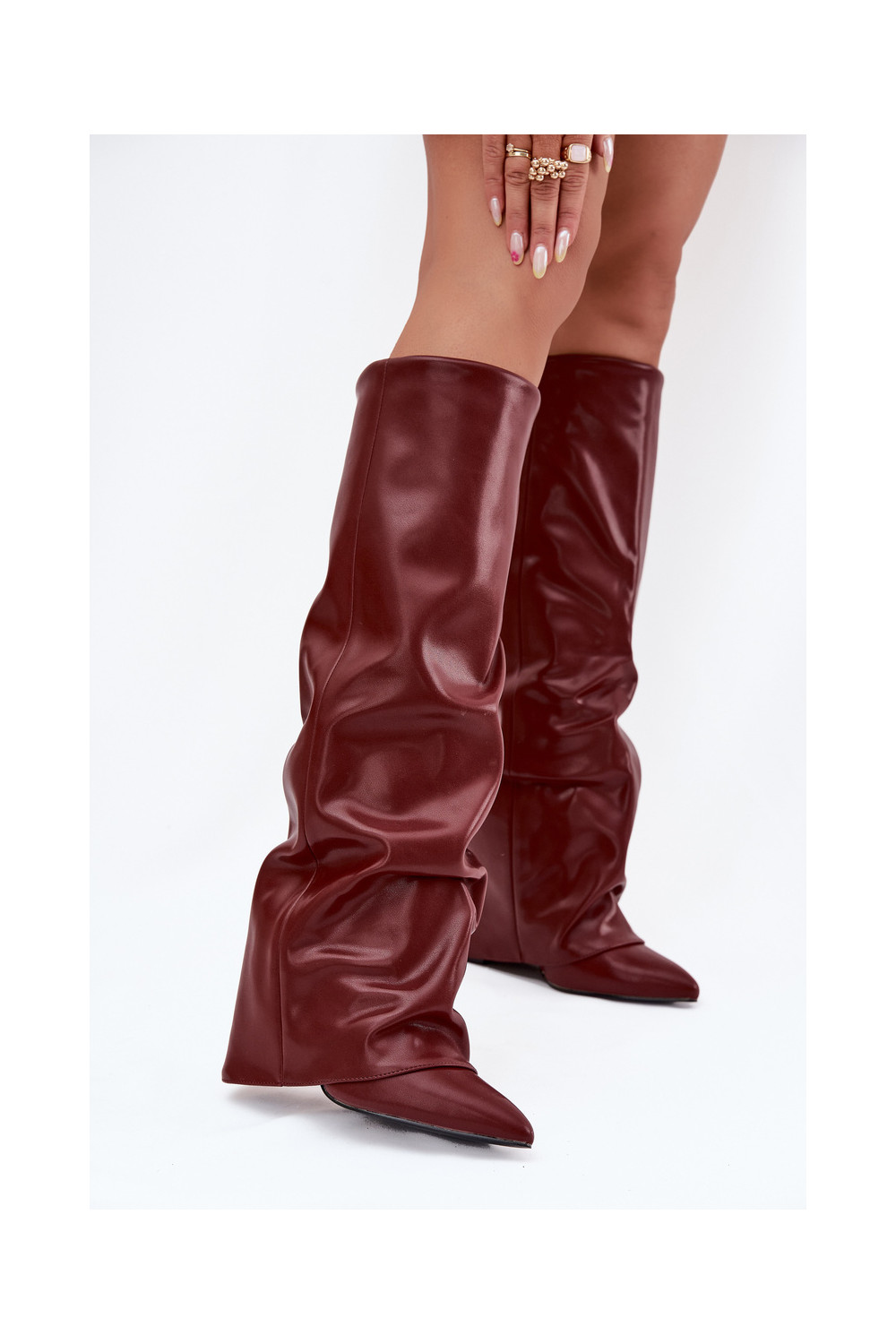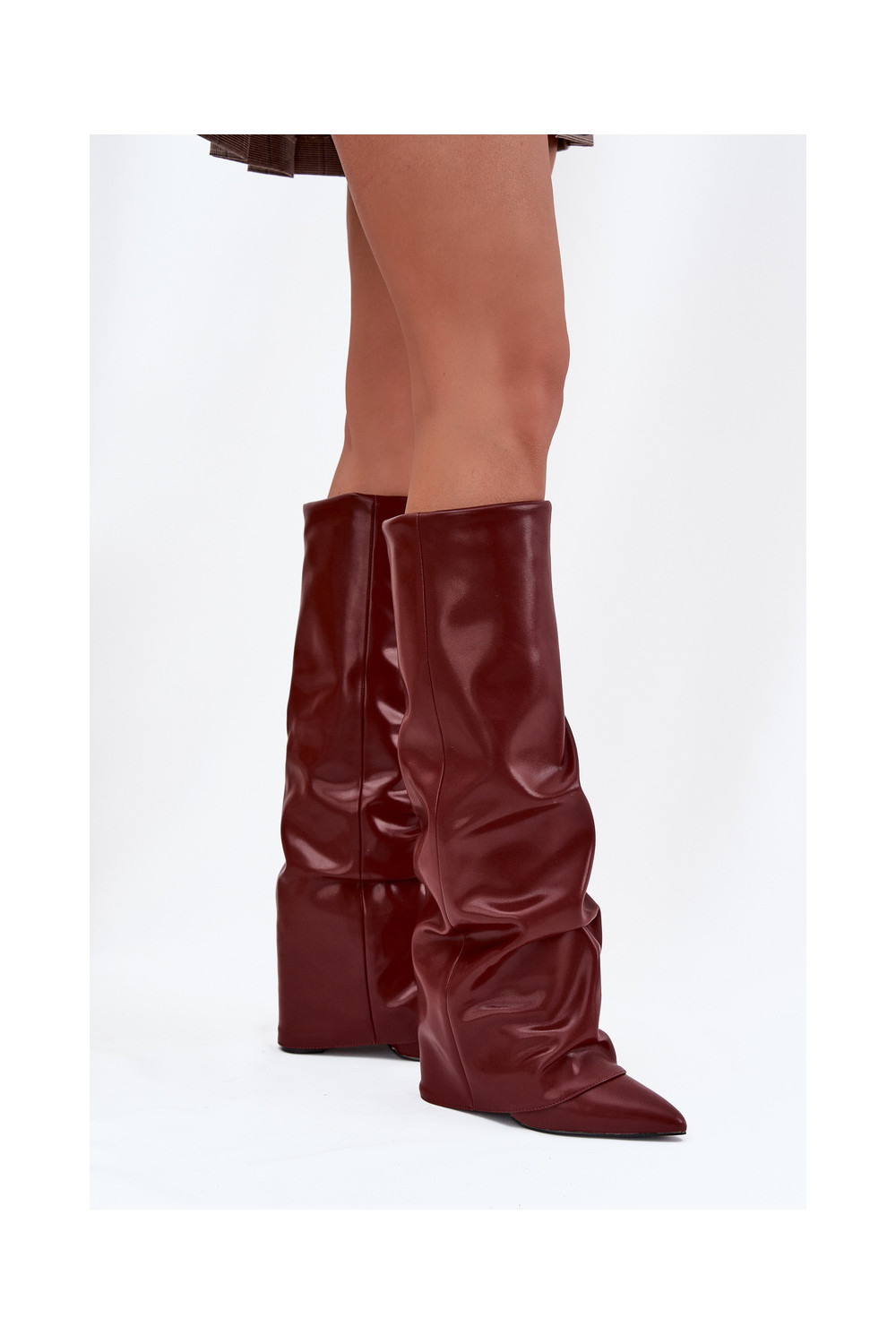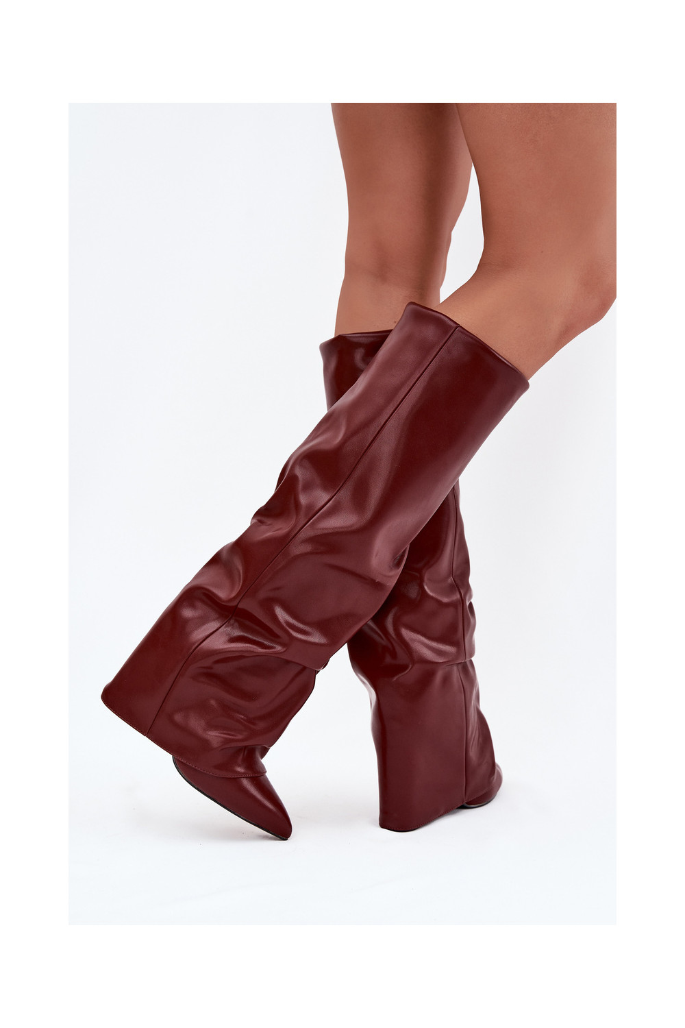 zateplené dámské dlouhé boty Z Wywiniętą Cholewką s podpatky vínová Elivira