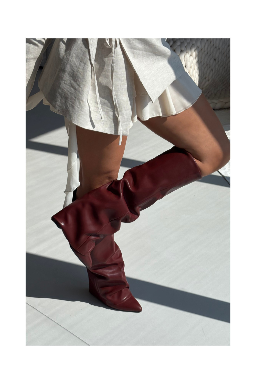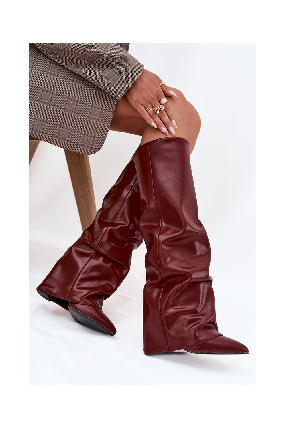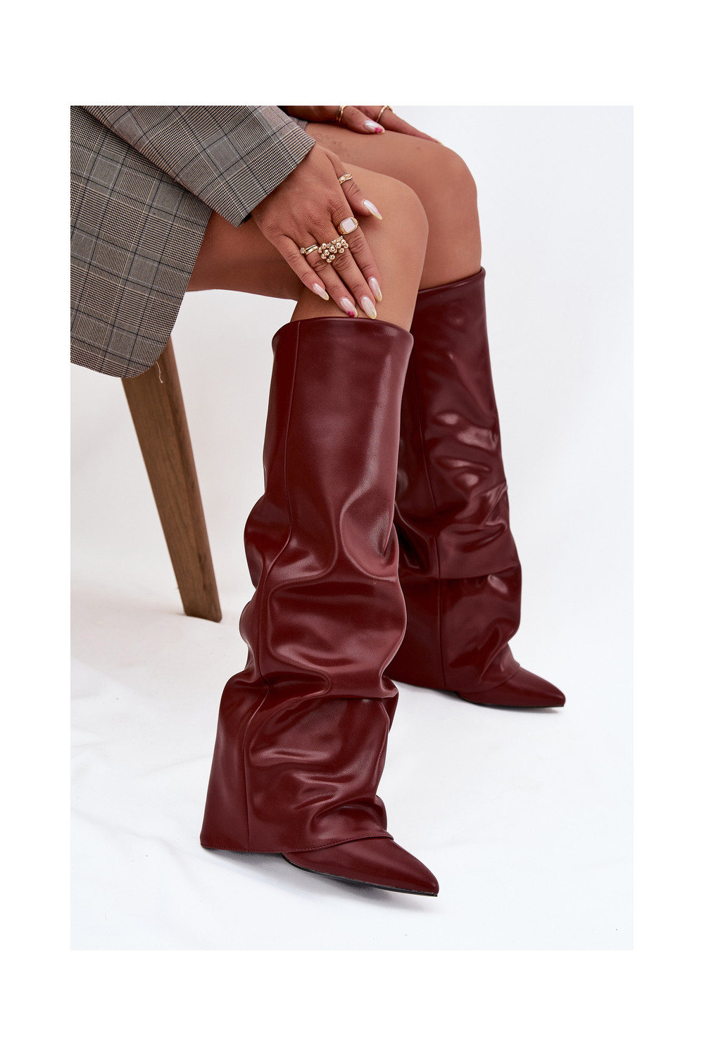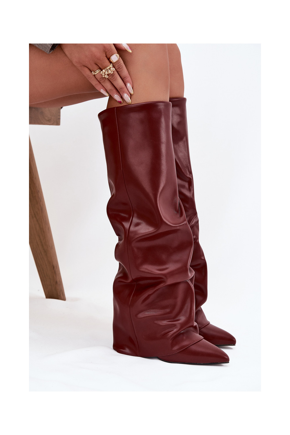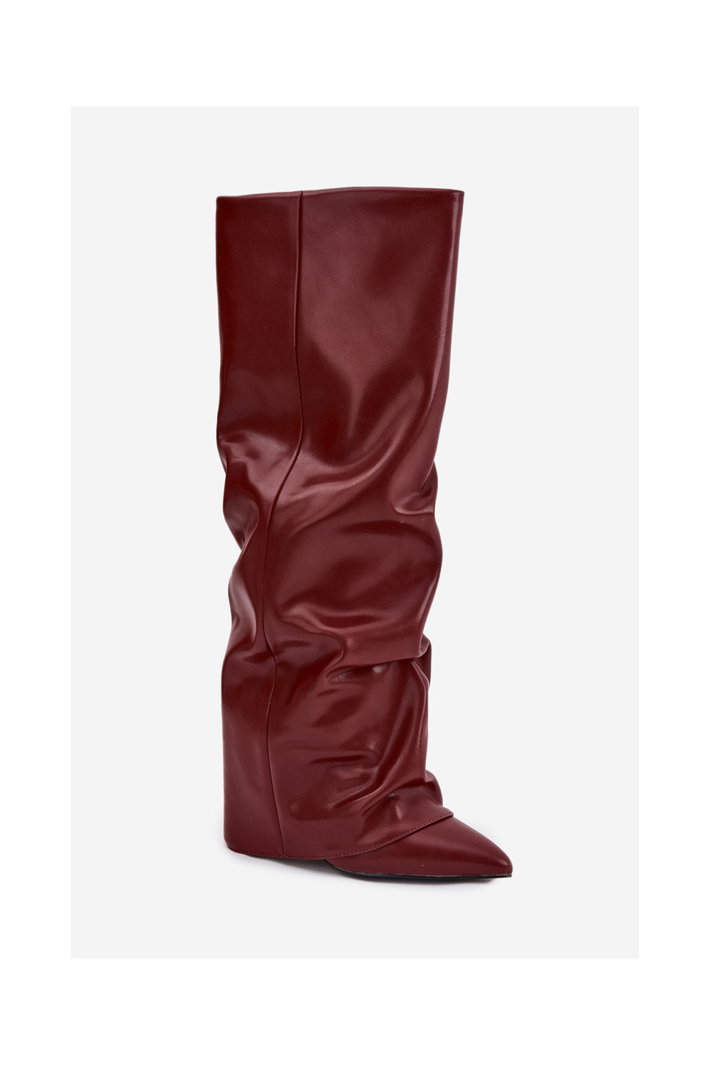 zateplené dámské dlouhé boty Z Wywiniętą Cholewką s podpatky vínová Elivira