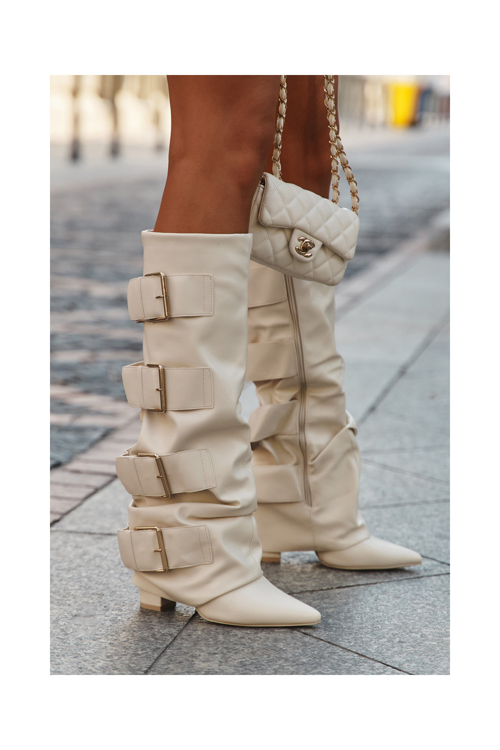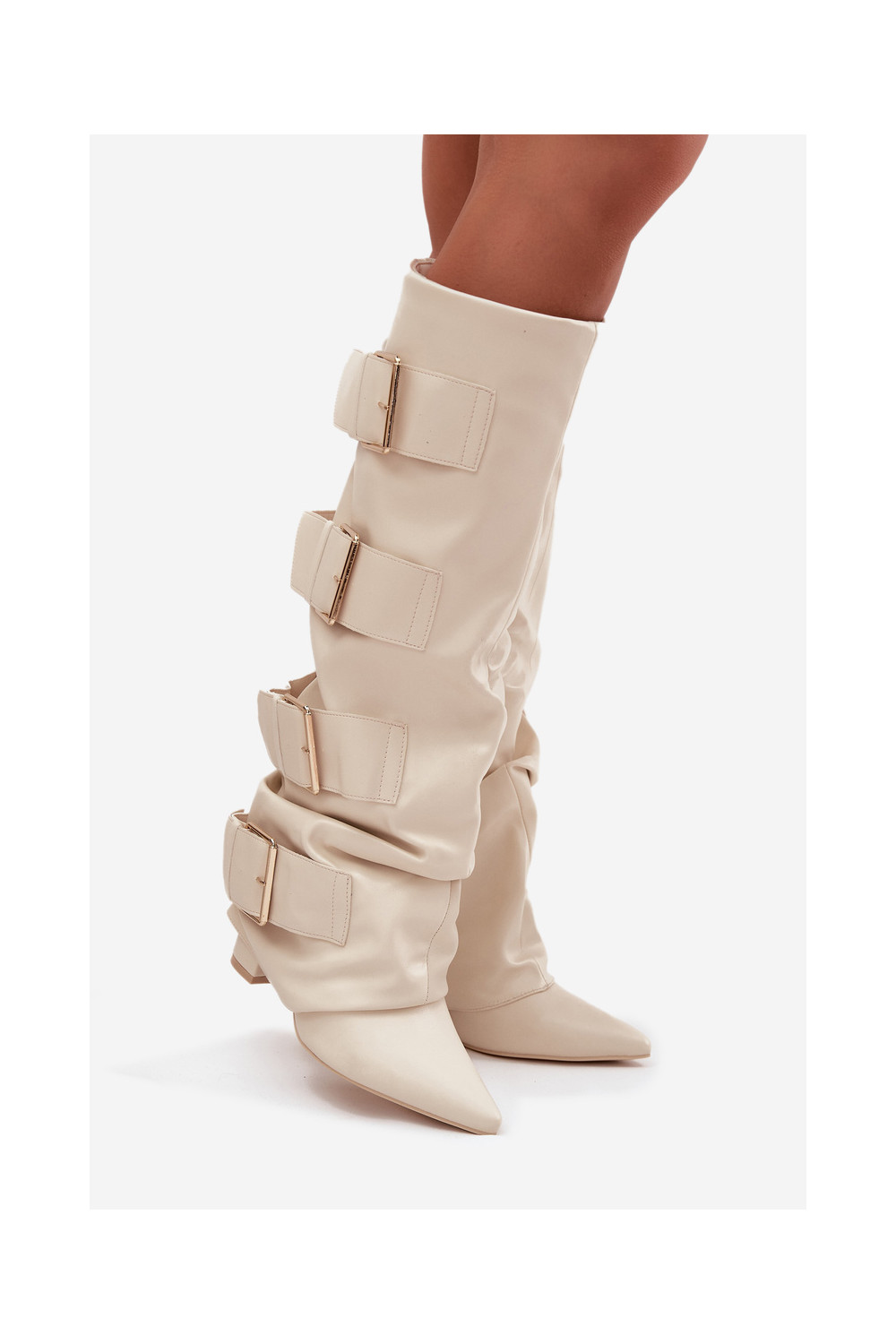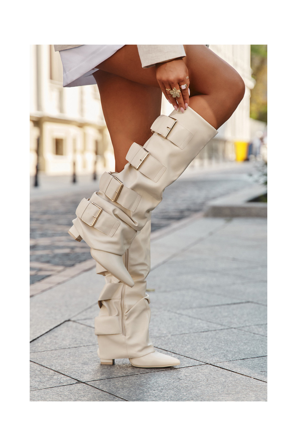 dámské dlouhé boty s podpatky Z Wywiniętą Cholewką I zlaté barvymi s přezkamimi slonová kost Isavelle