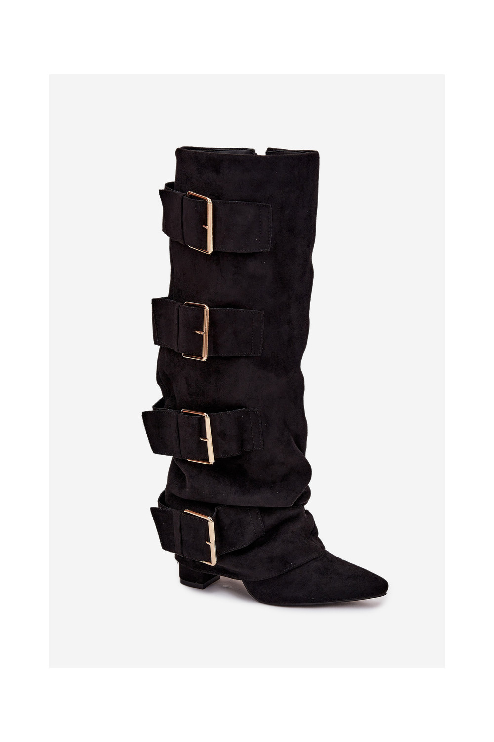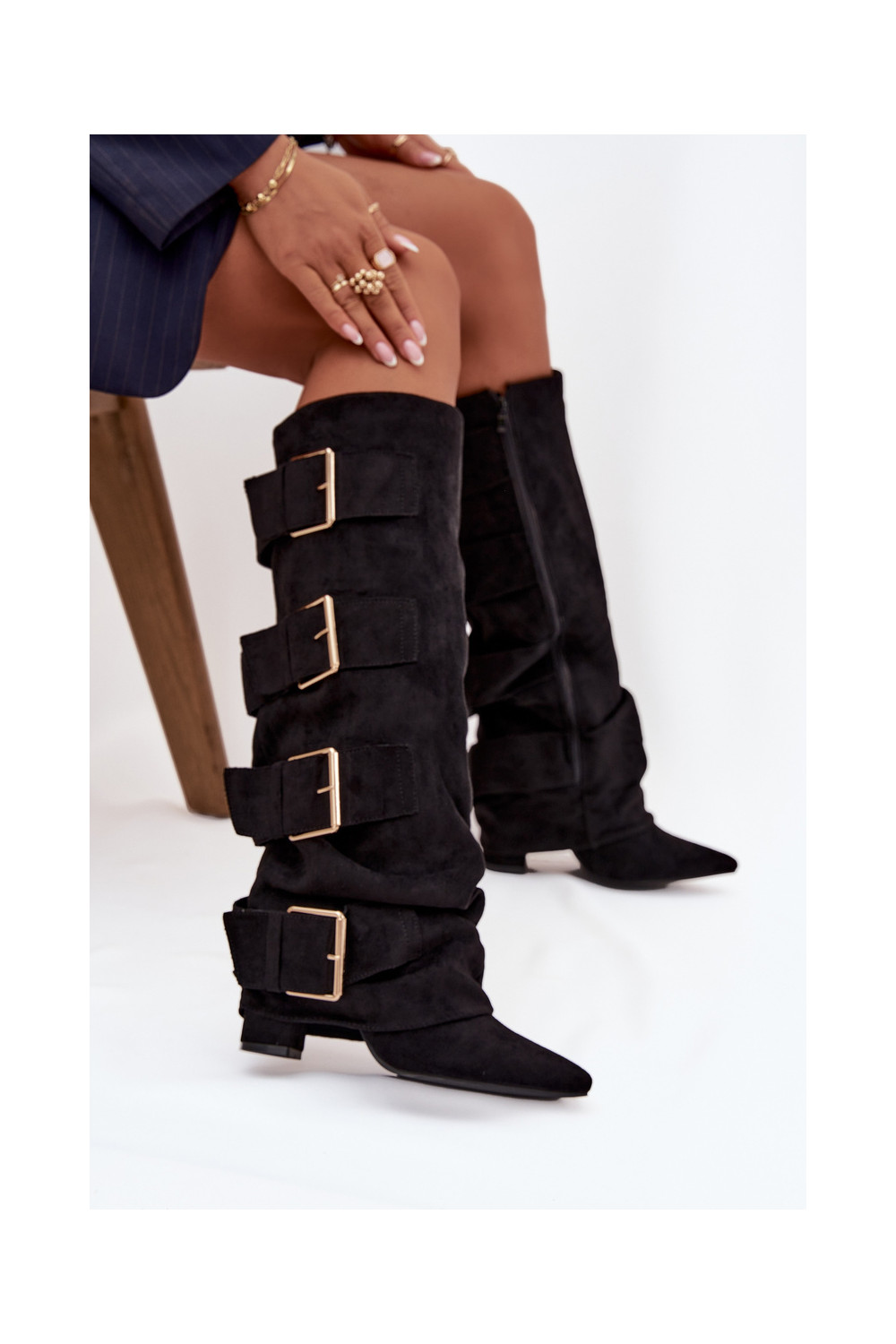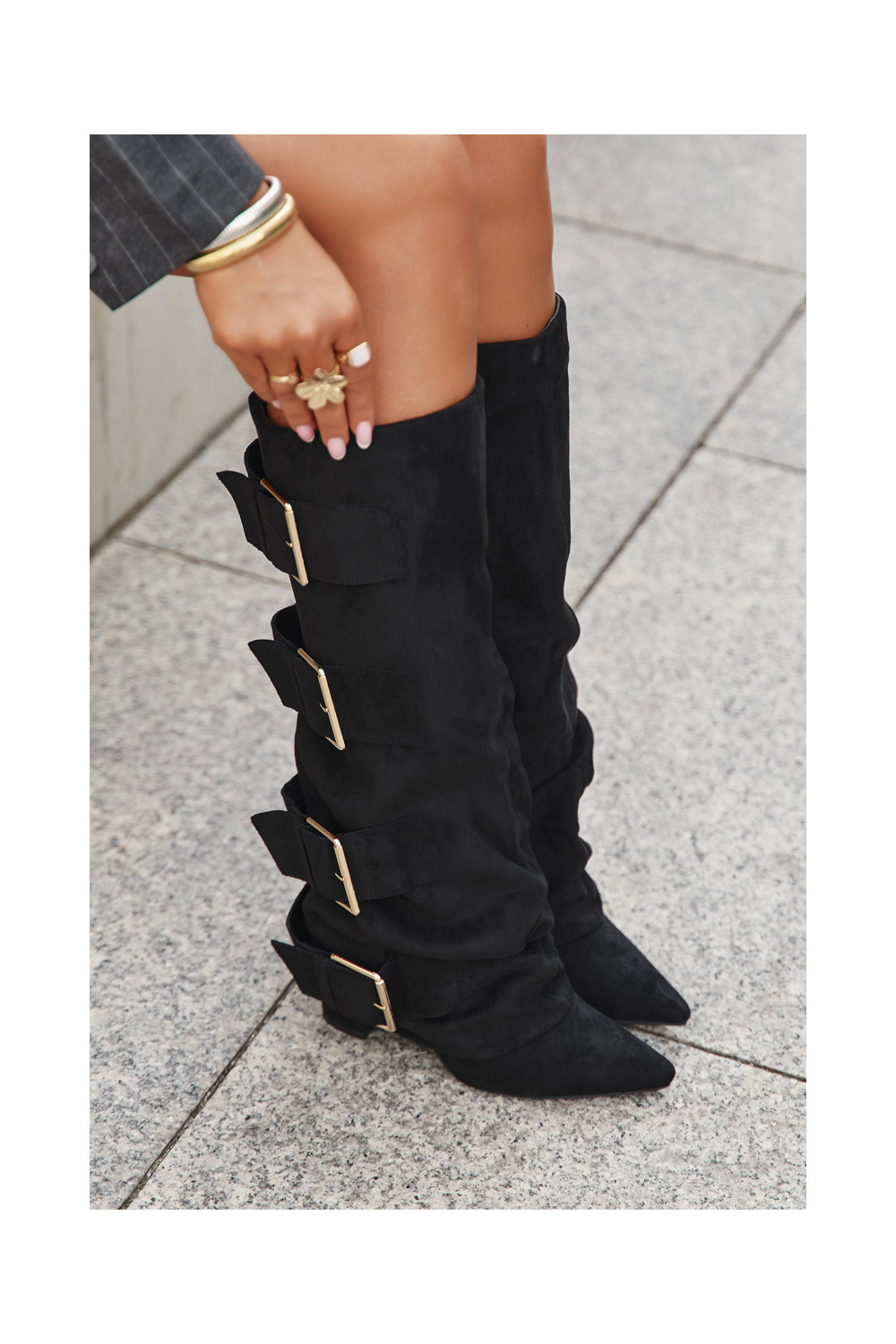 dámské dlouhé boty s podpatky Z Wywiniętą Cholewką I zlaté barvymi s přezkamimi z eko semišeowe Černé Isavelle