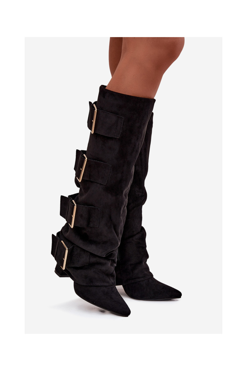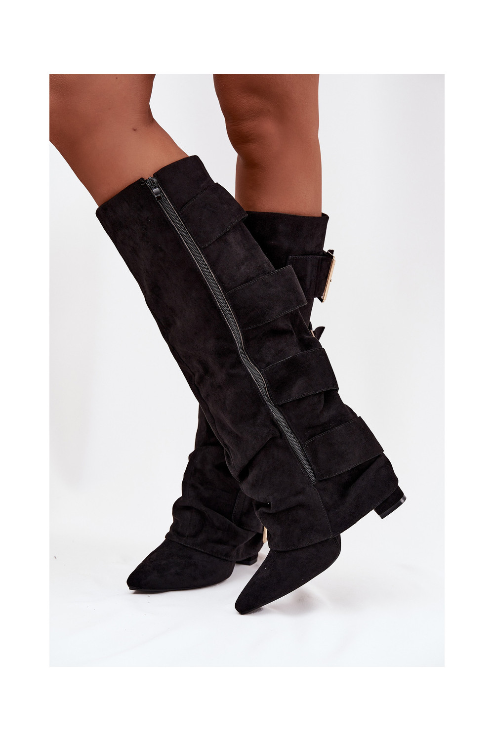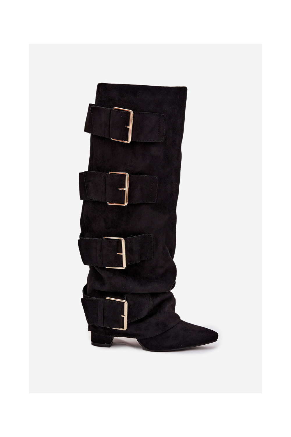 dámské dlouhé boty s podpatky Z Wywiniętą Cholewką I zlaté barvymi s přezkamimi z eko semišeowe Černé Isavelle