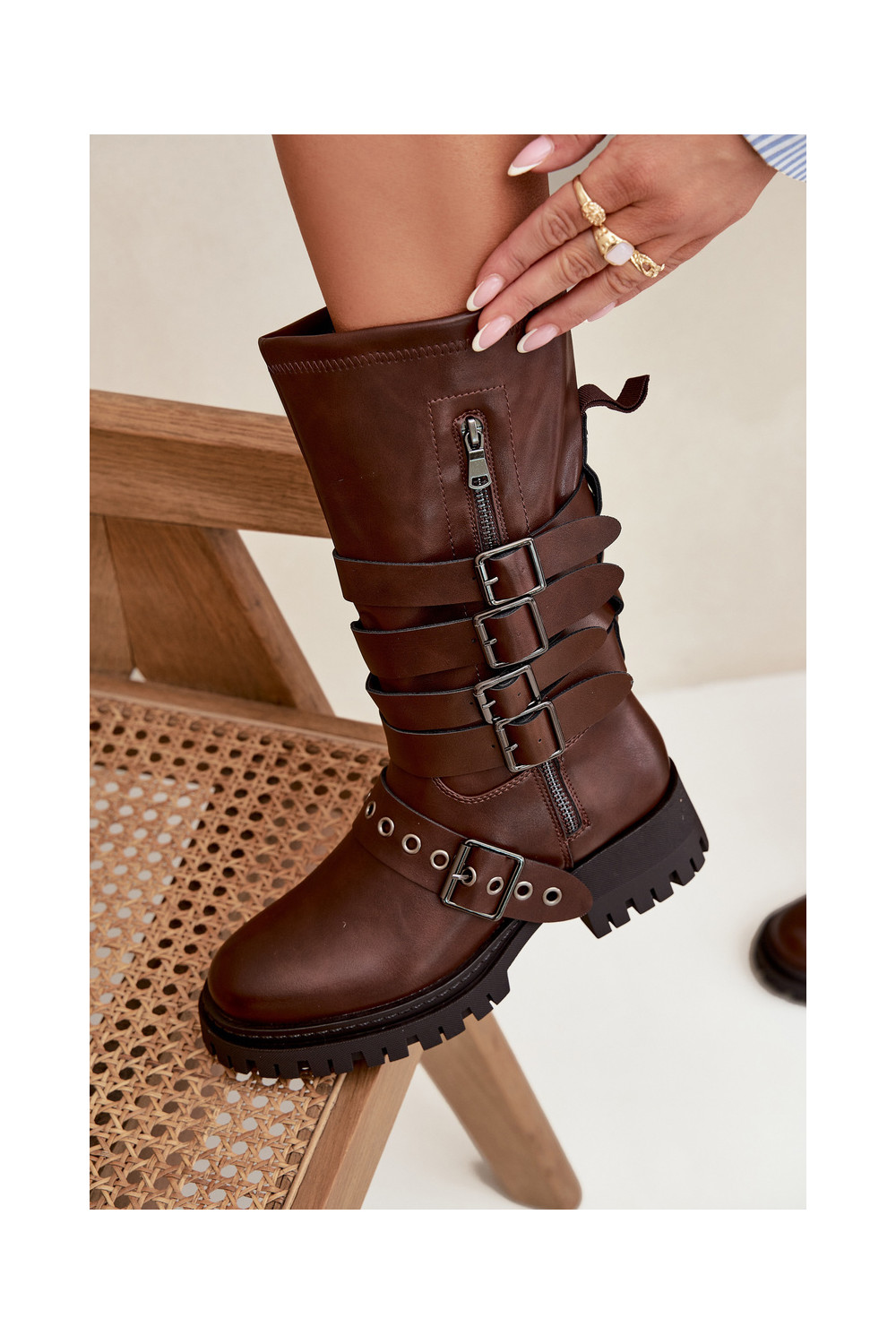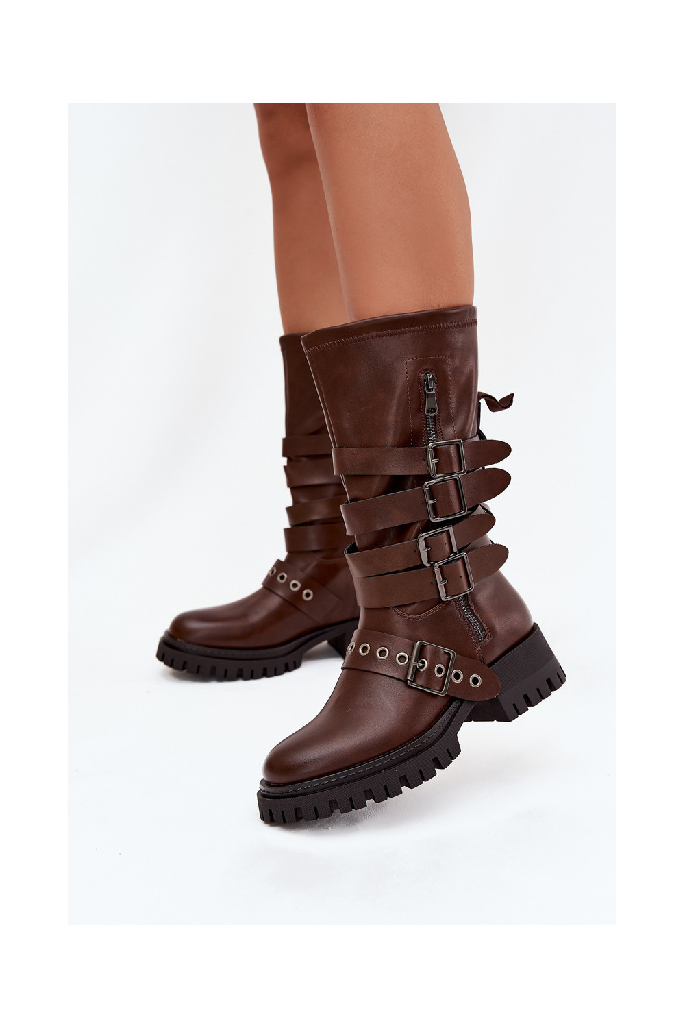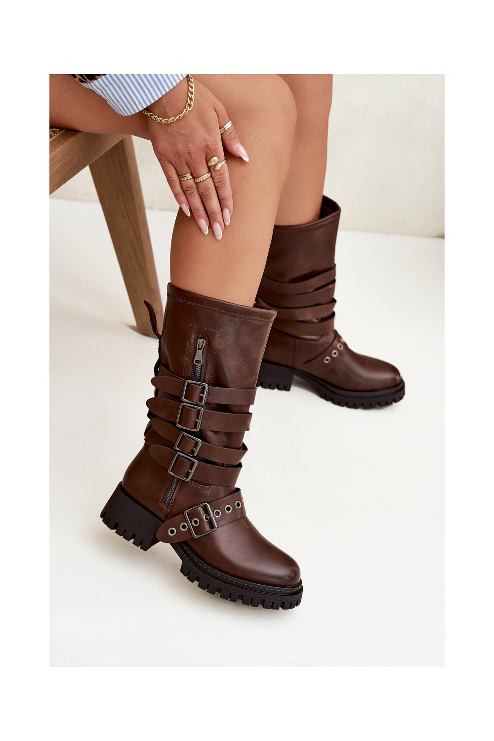 zateplené dámské dlouhé boty s pruhy I s přezkamimi hnědá Ivaline