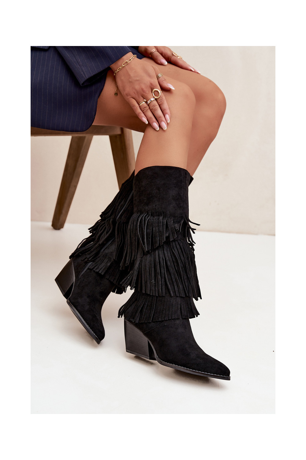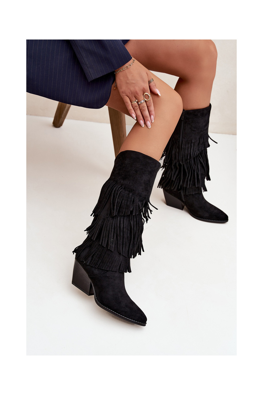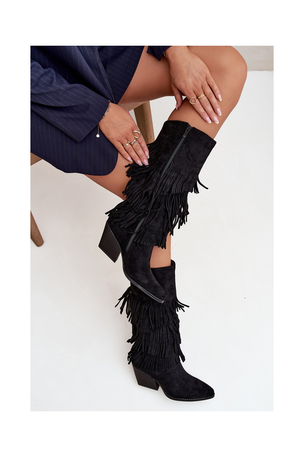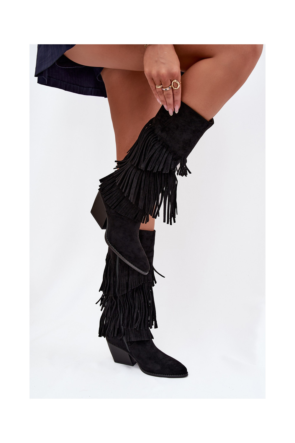 zateplené dlouhé boty kovbojský styl se střapci Černé Brivina