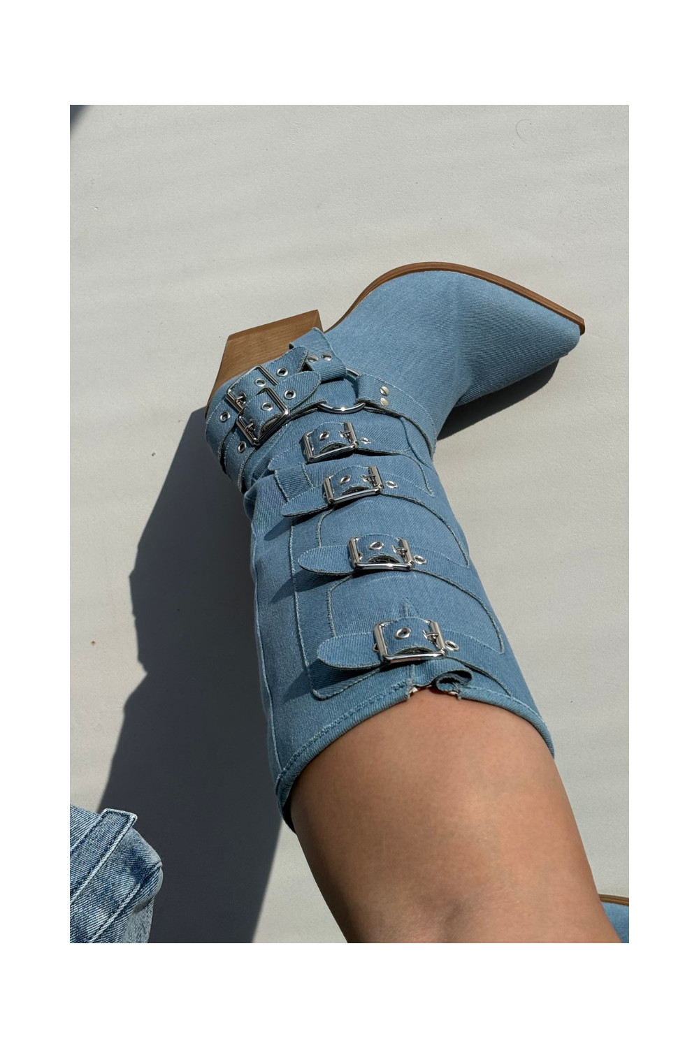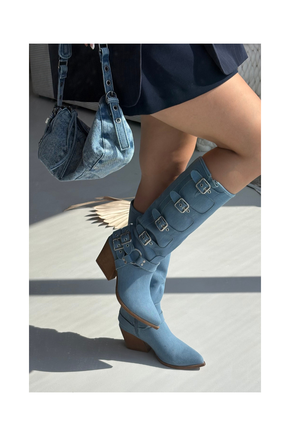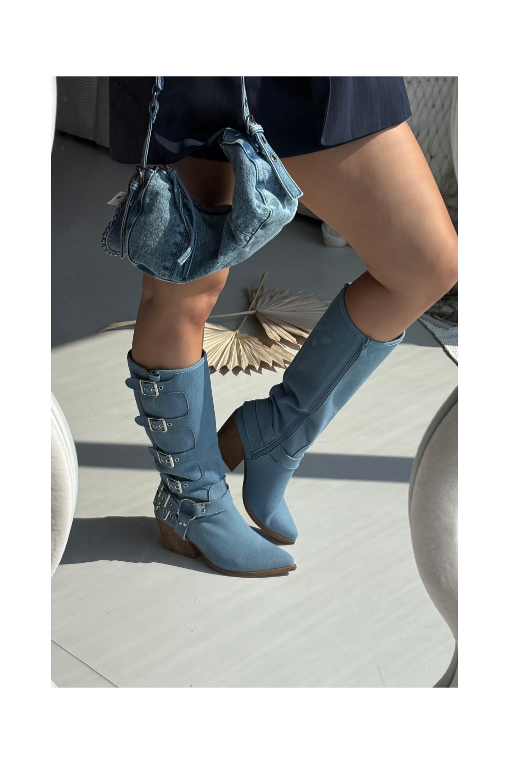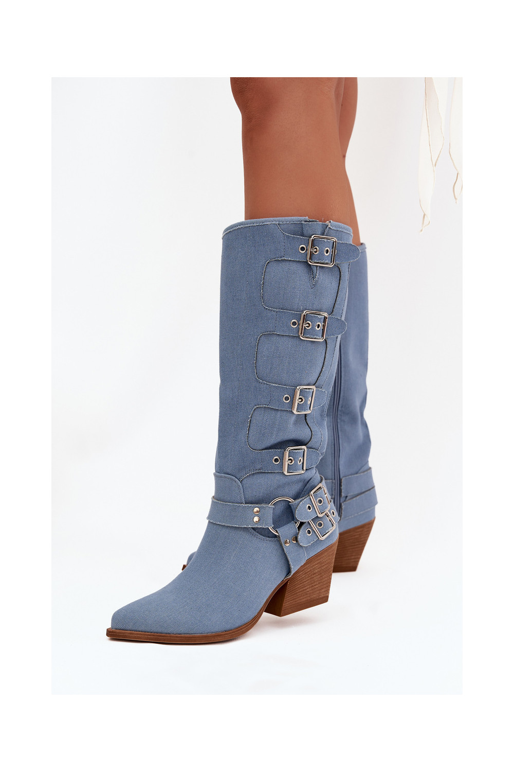 dlouhé boty kovbojský styl s podpatky s přezkami Džínový materiál Fivelle