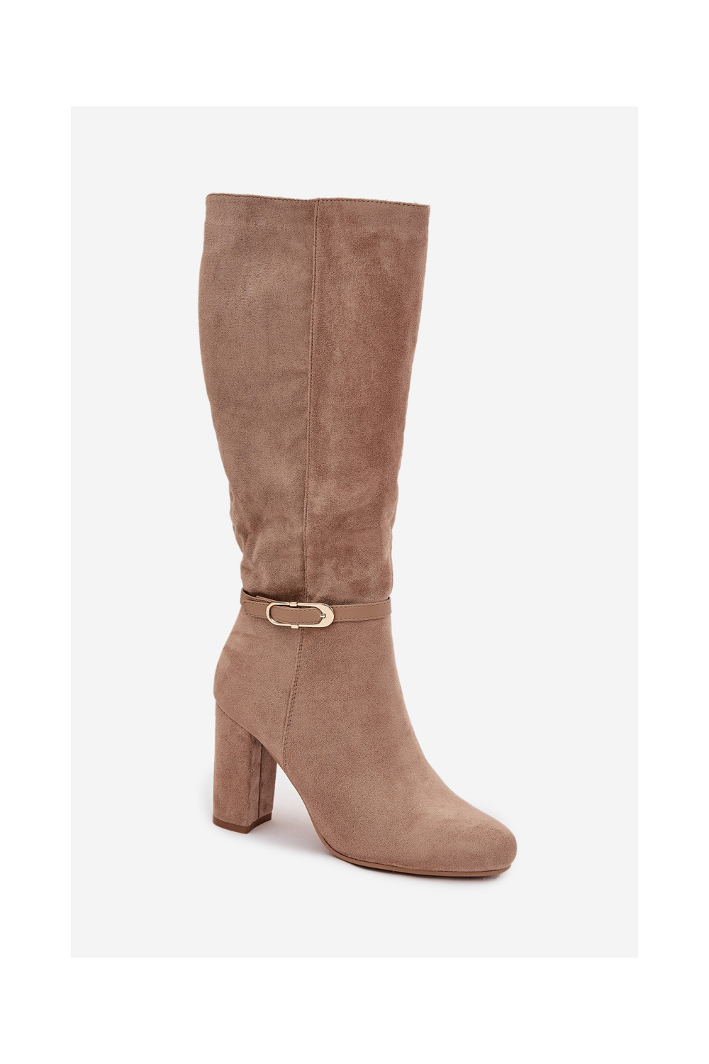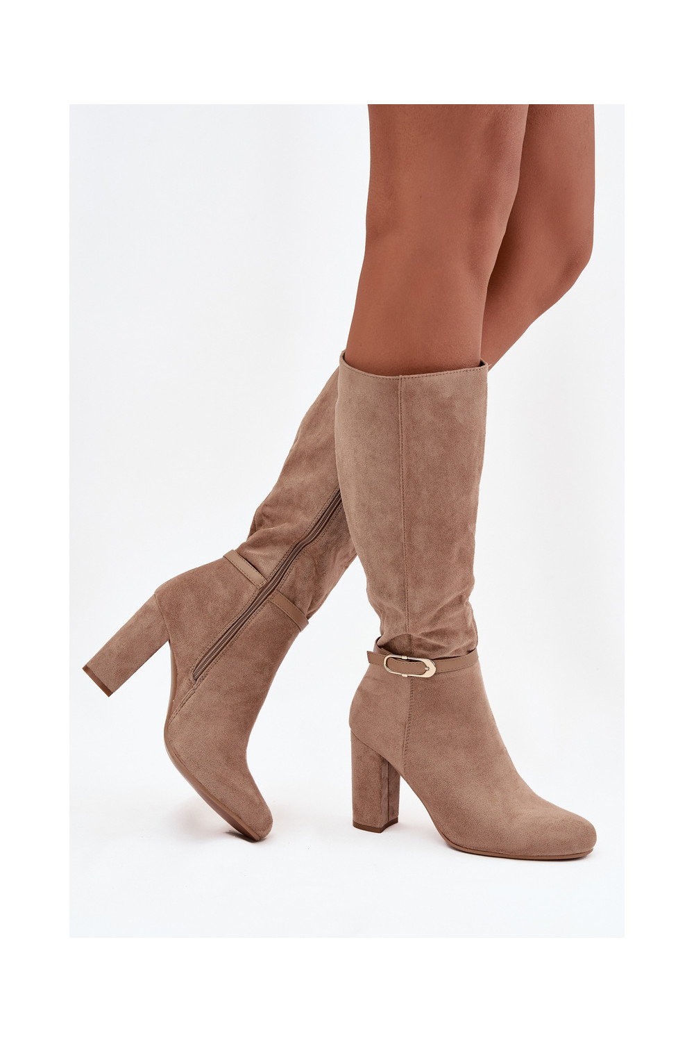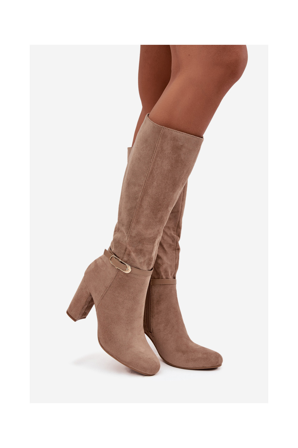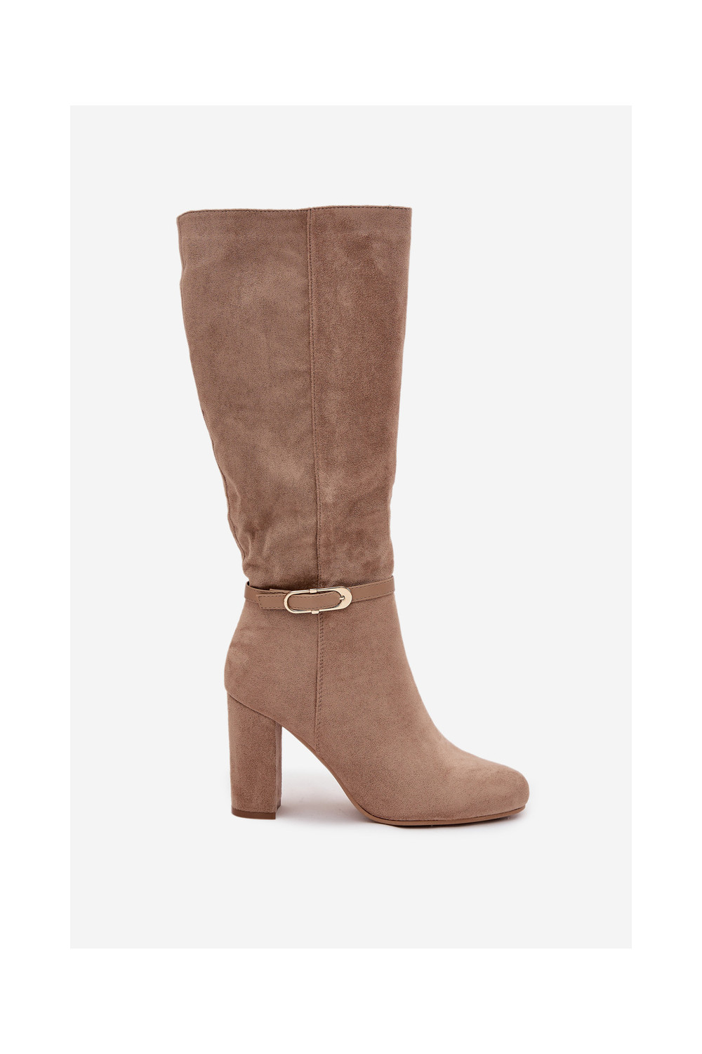 dámské dlouhé boty s podpatky se zlatými přezkami zateplené béžové Seraphine