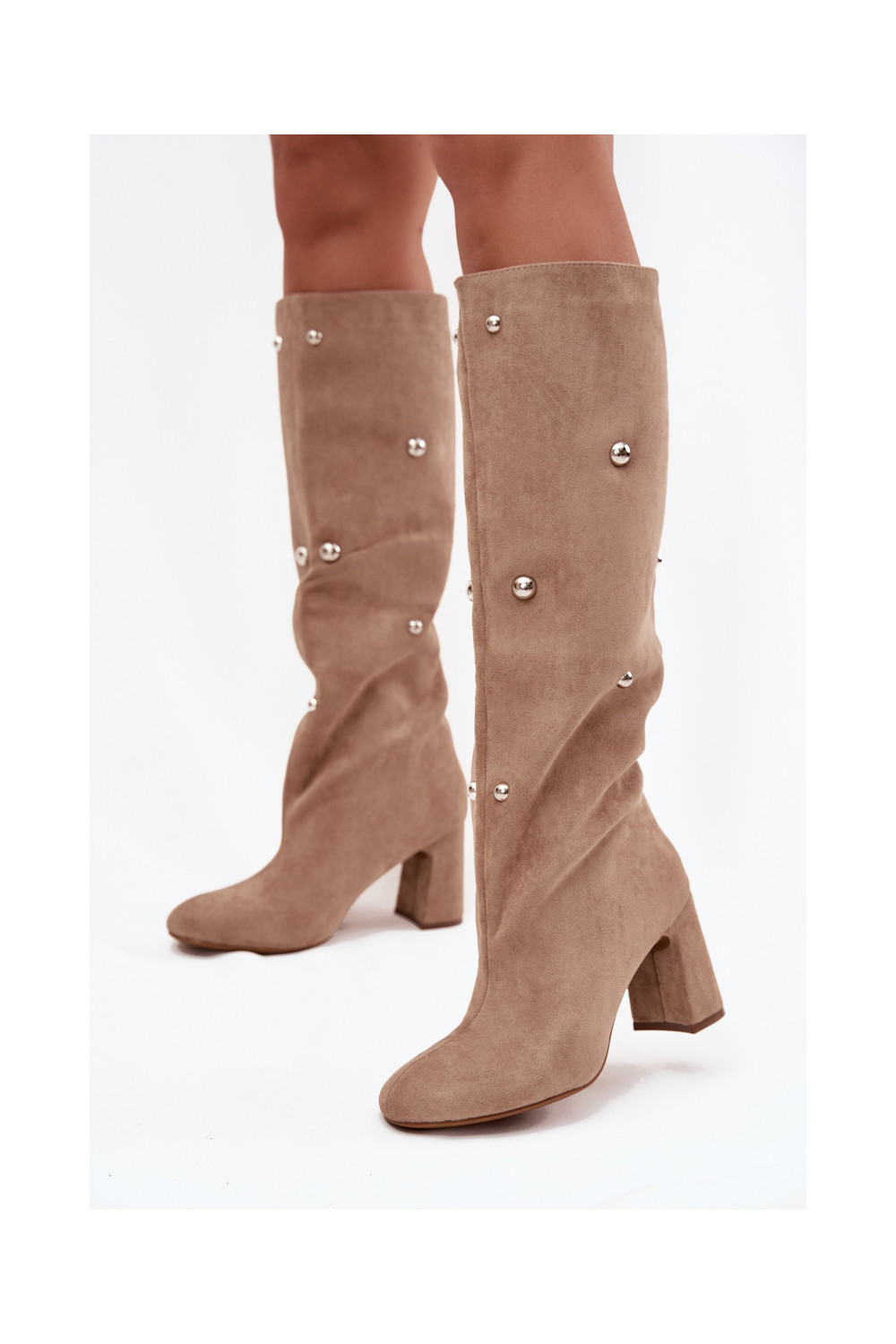 Teplé dlouhé kozačky s podpatky Detalami béžové Lucinda