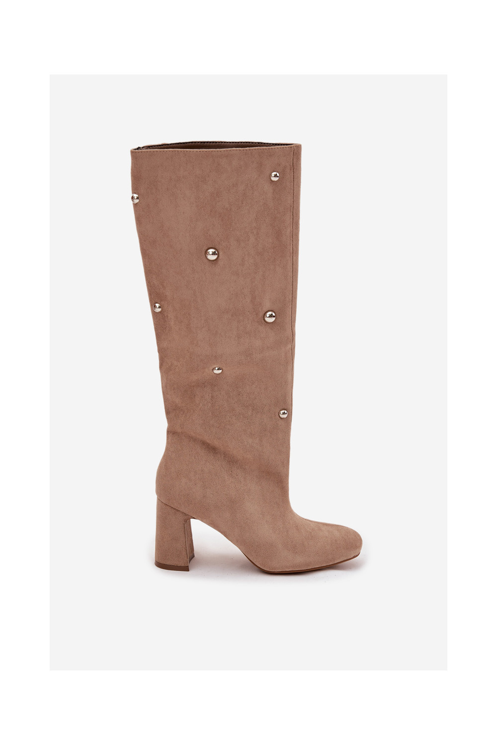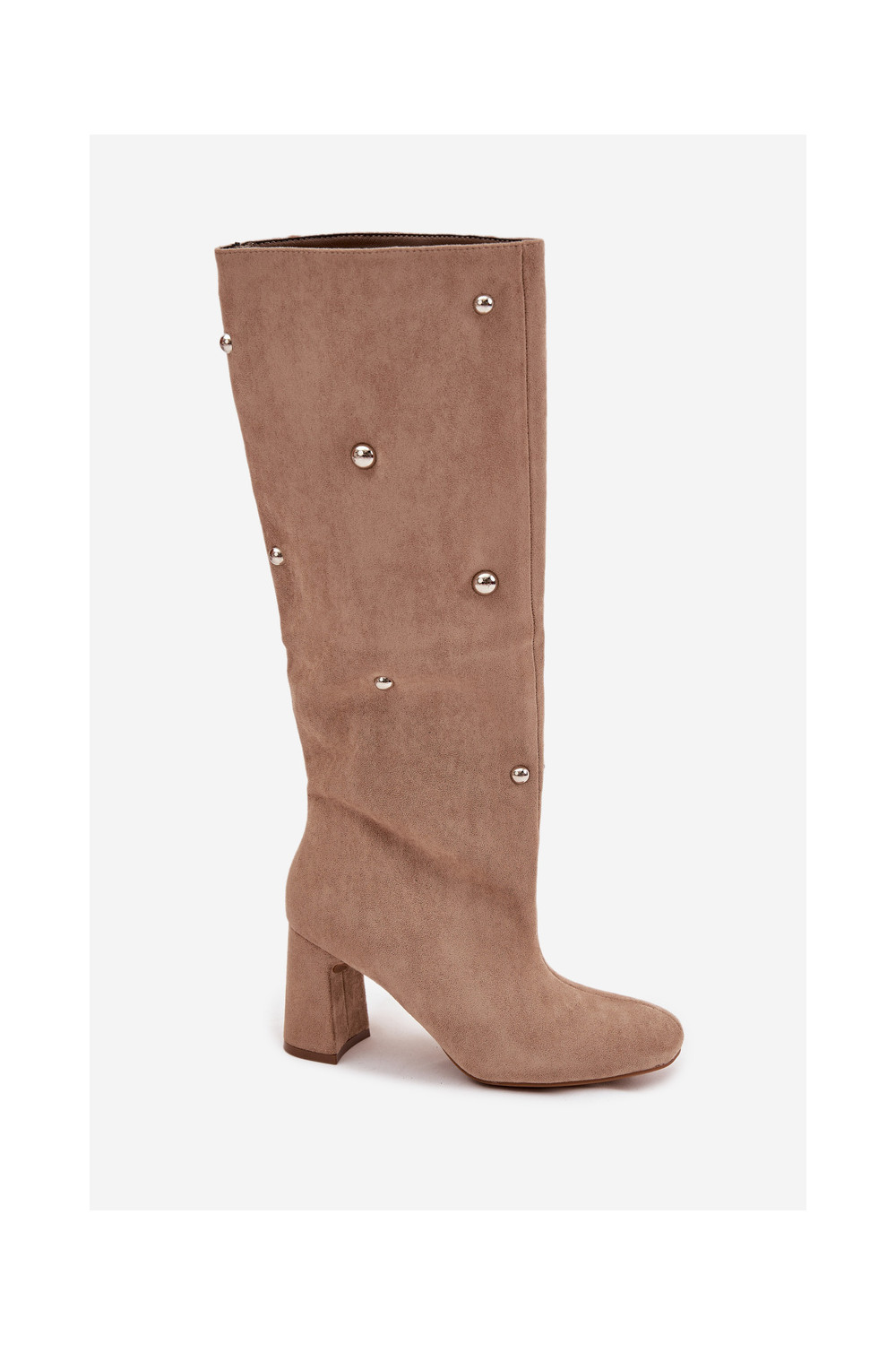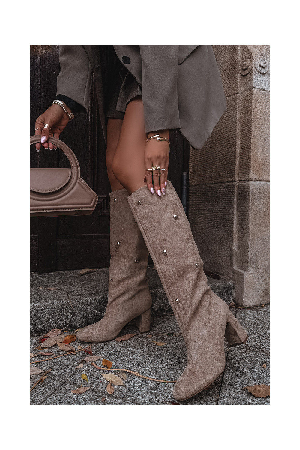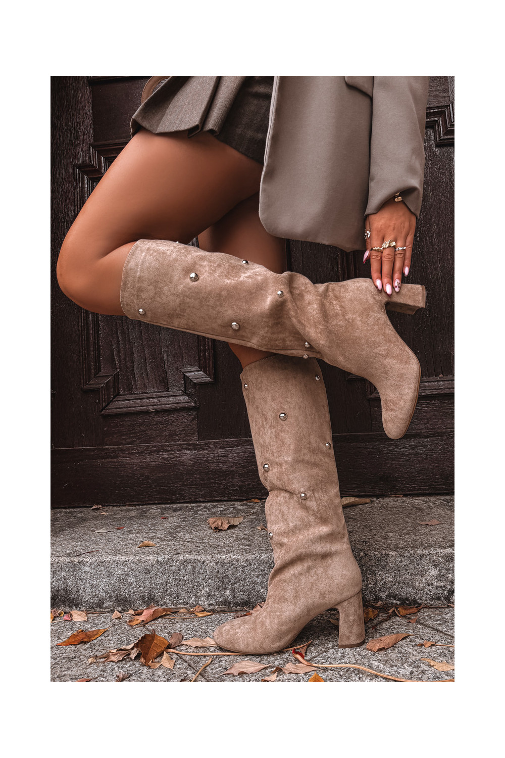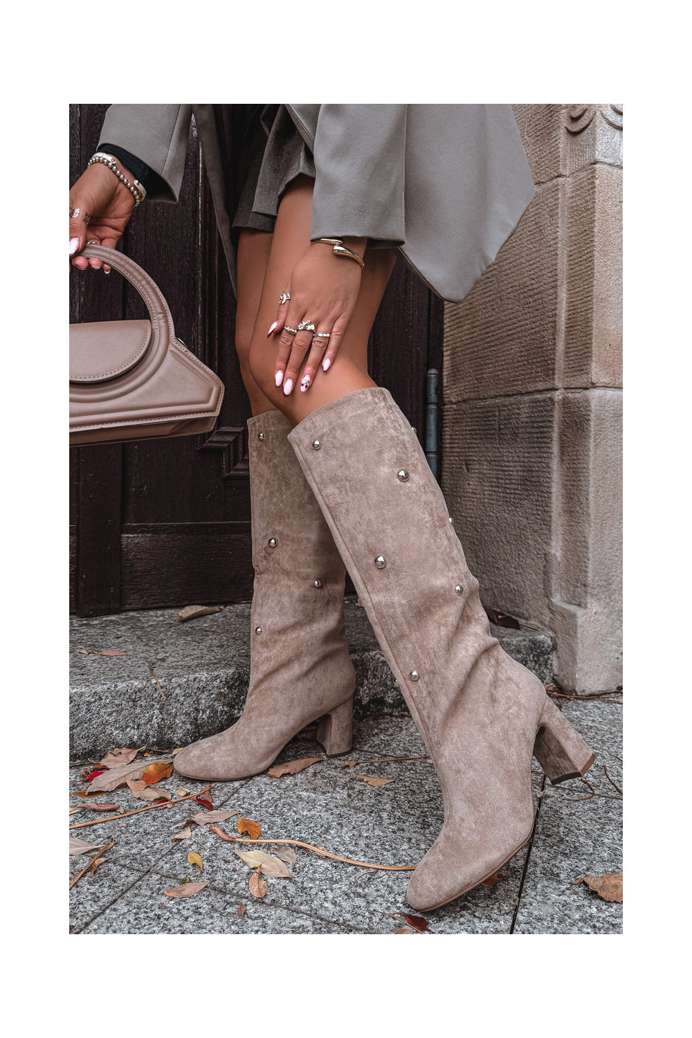 Teplé dlouhé kozačky s podpatky Detalami béžové Lucinda