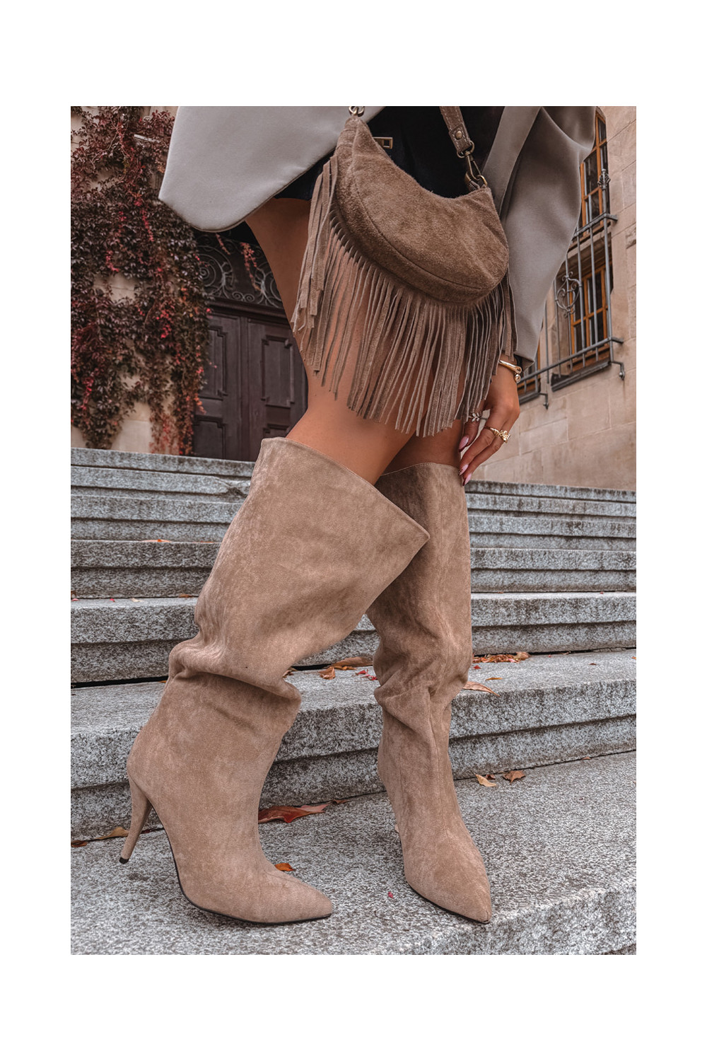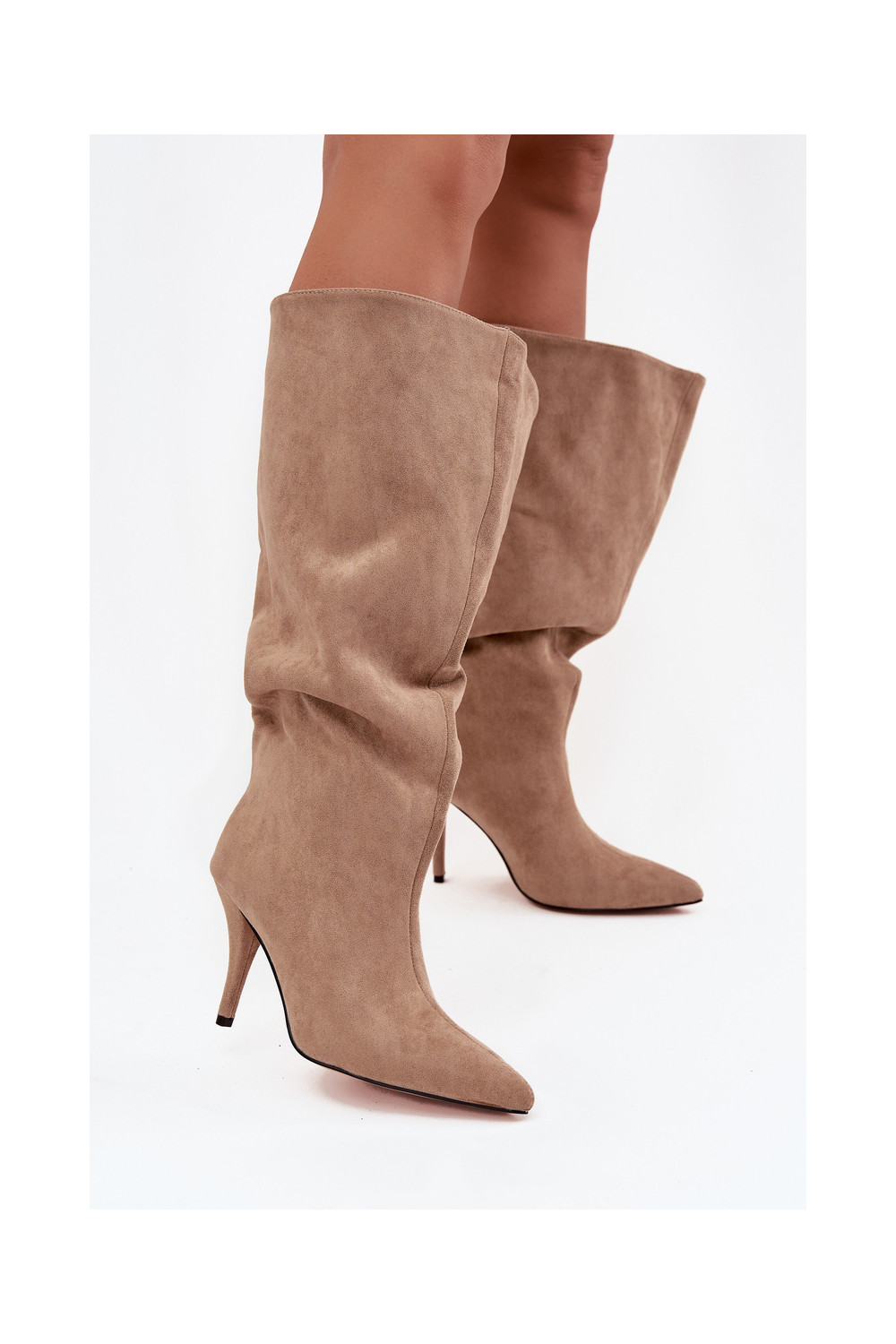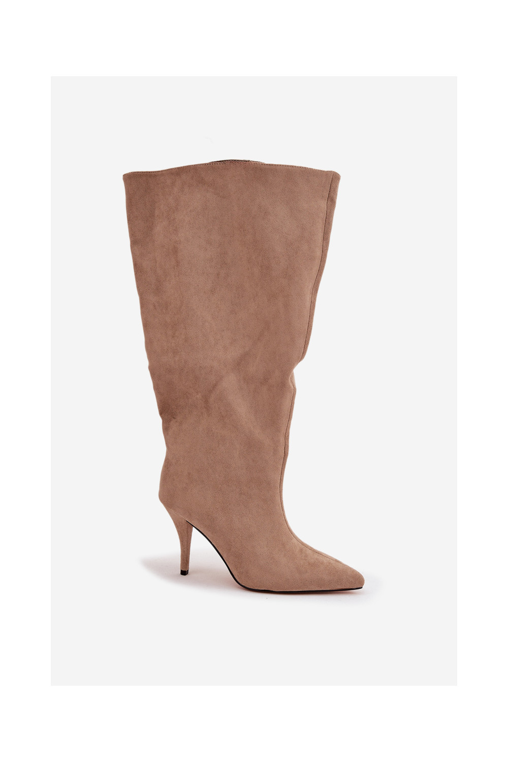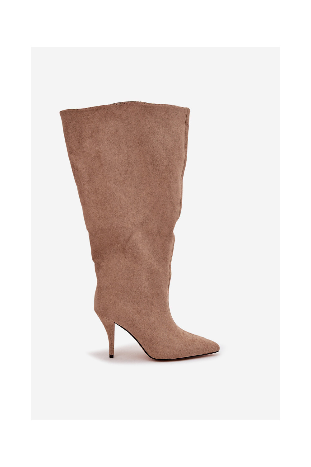 Slip-on vzor dámské dlouhé boty s tenkými podpatky Z z eko semišeu béžové Noretta