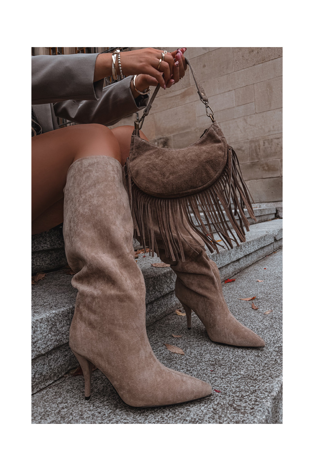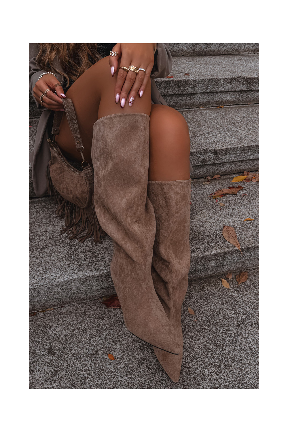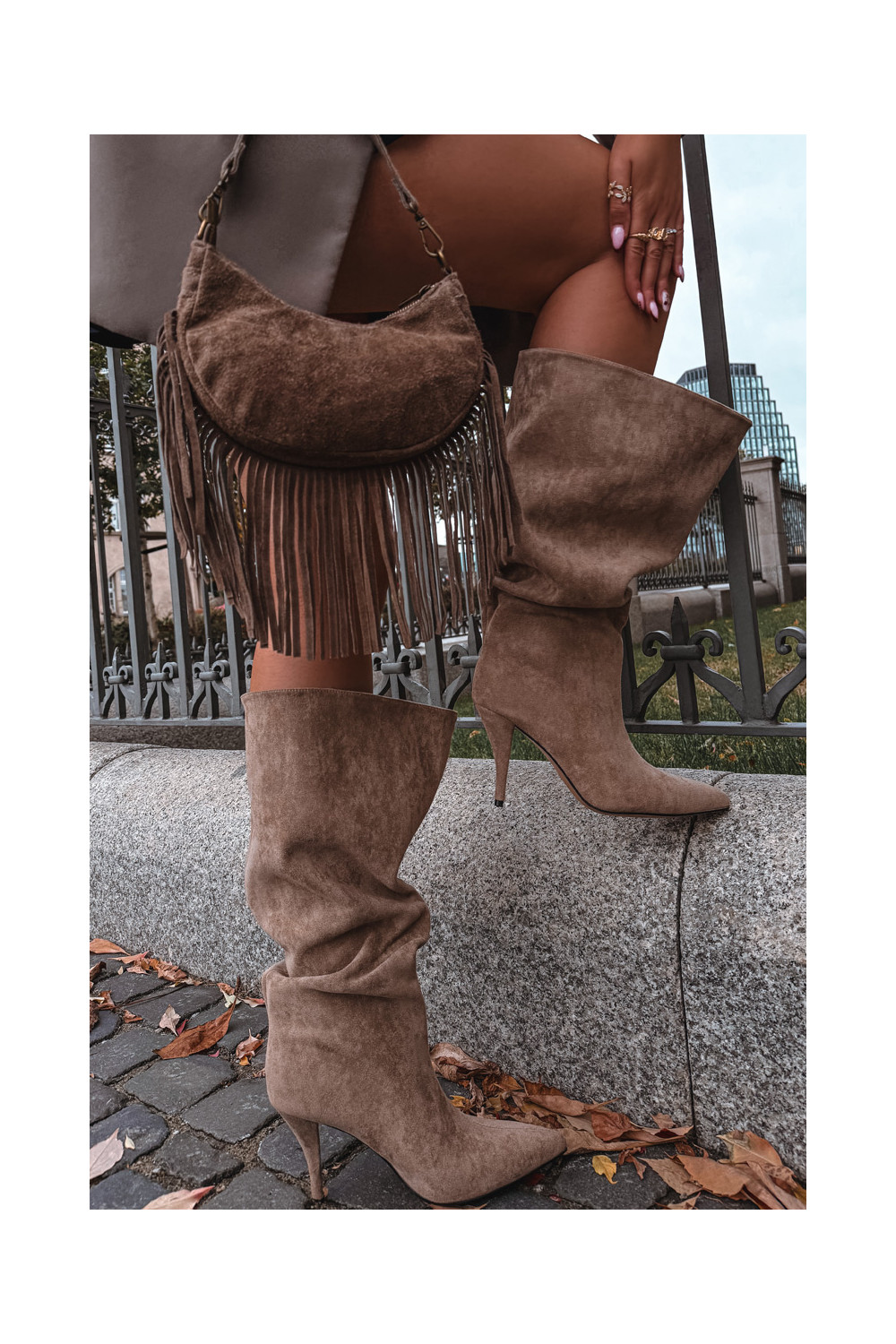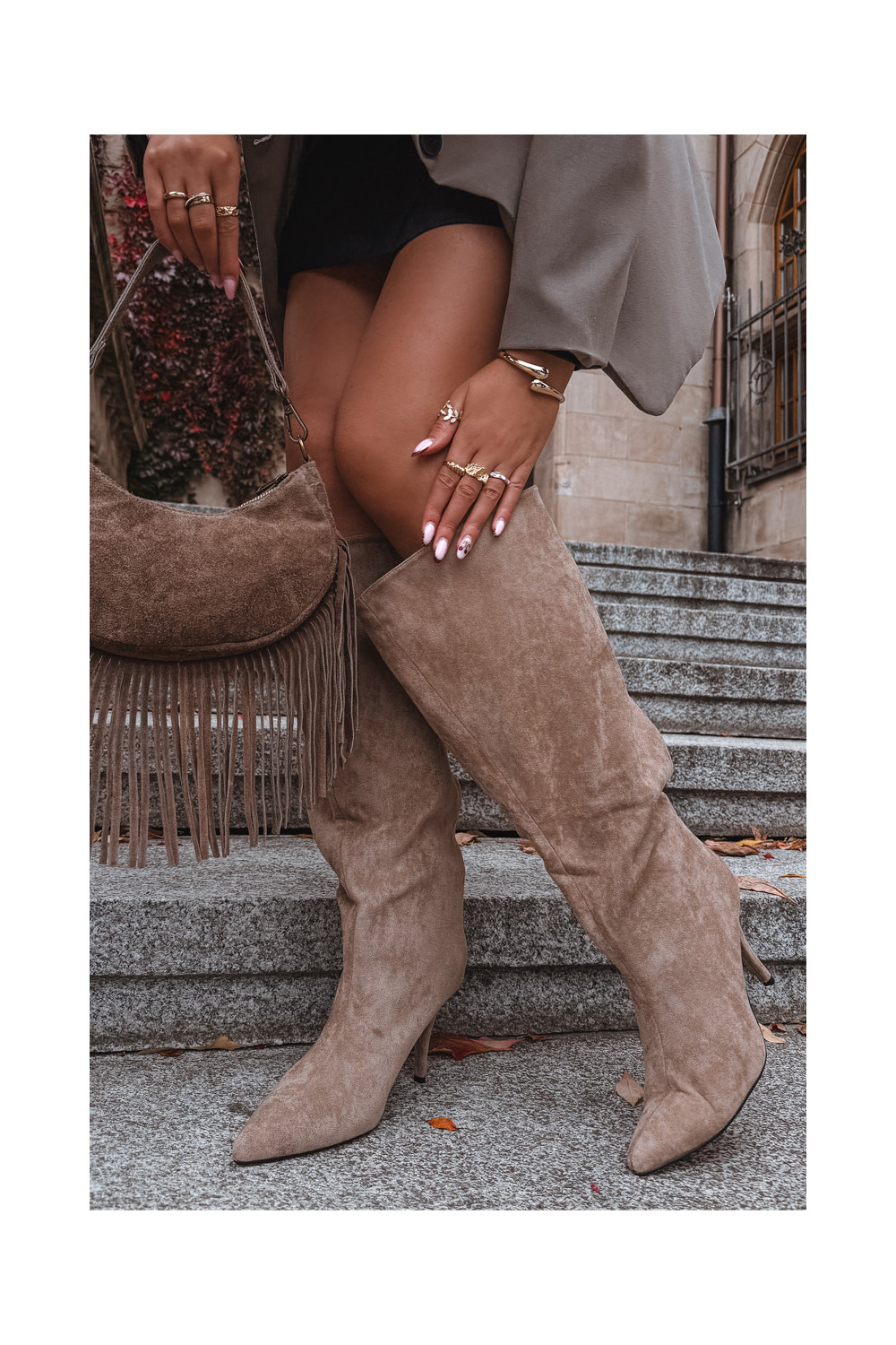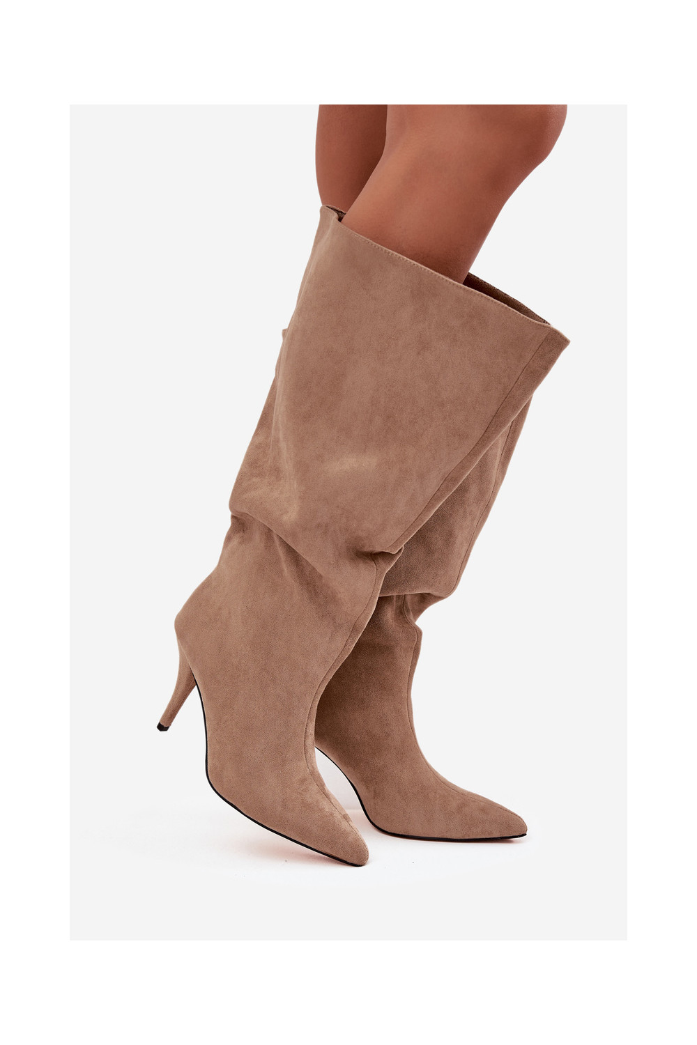 Slip-on vzor dámské dlouhé boty s tenkými podpatky Z z eko semišeu béžové Noretta