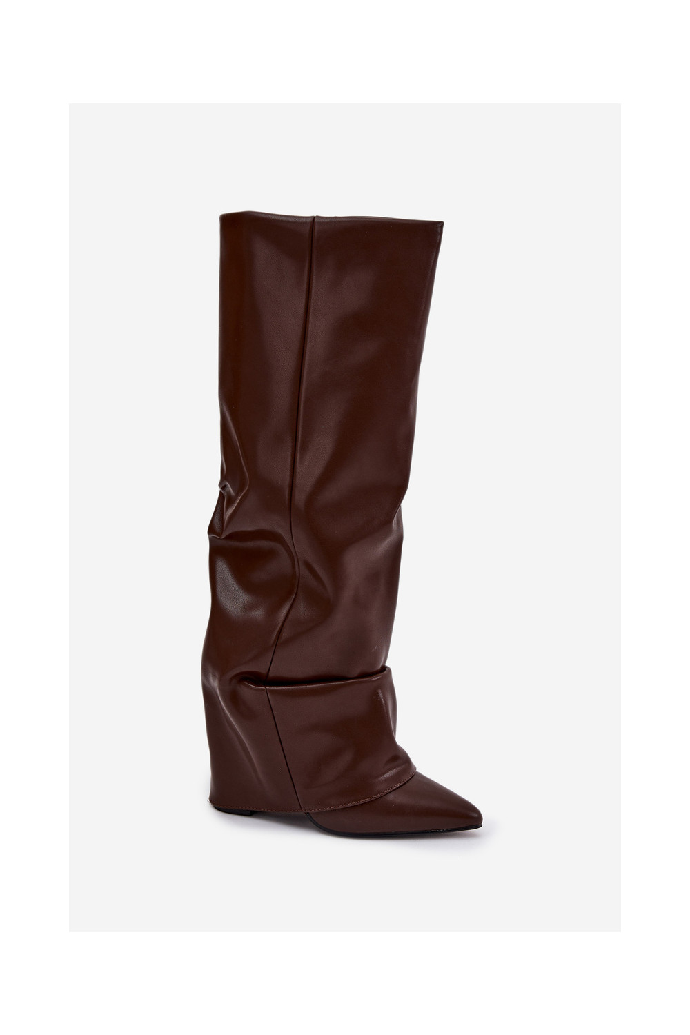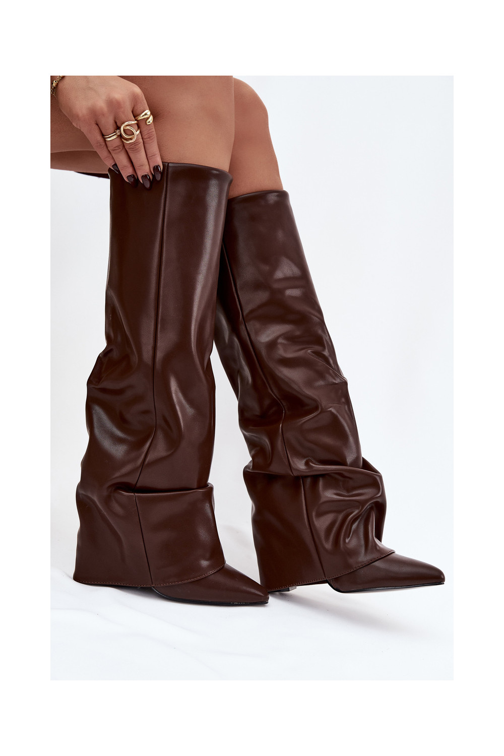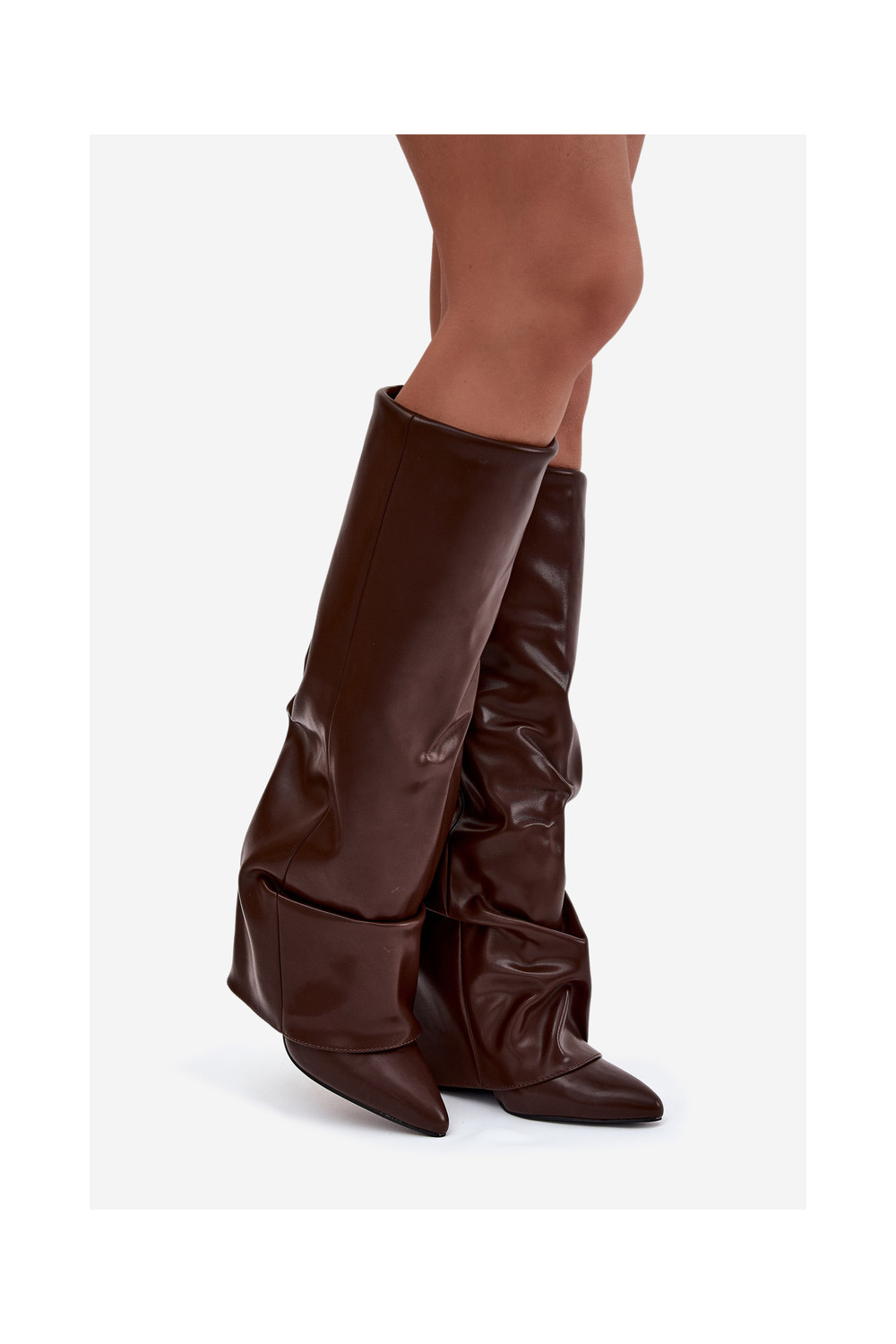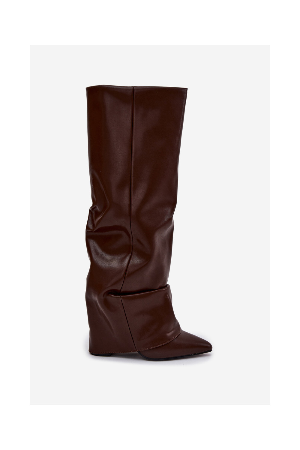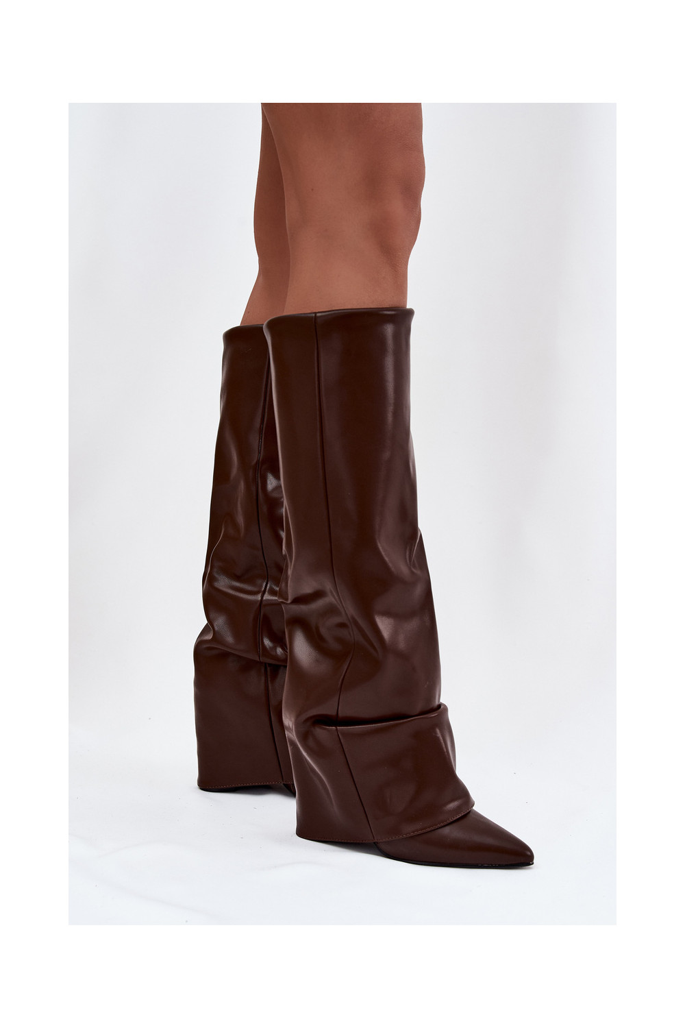 zateplené dámské dlouhé boty Z Wywiniętą Cholewką s podpatky Czekoladowe Elivira