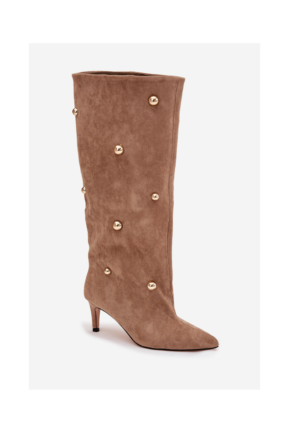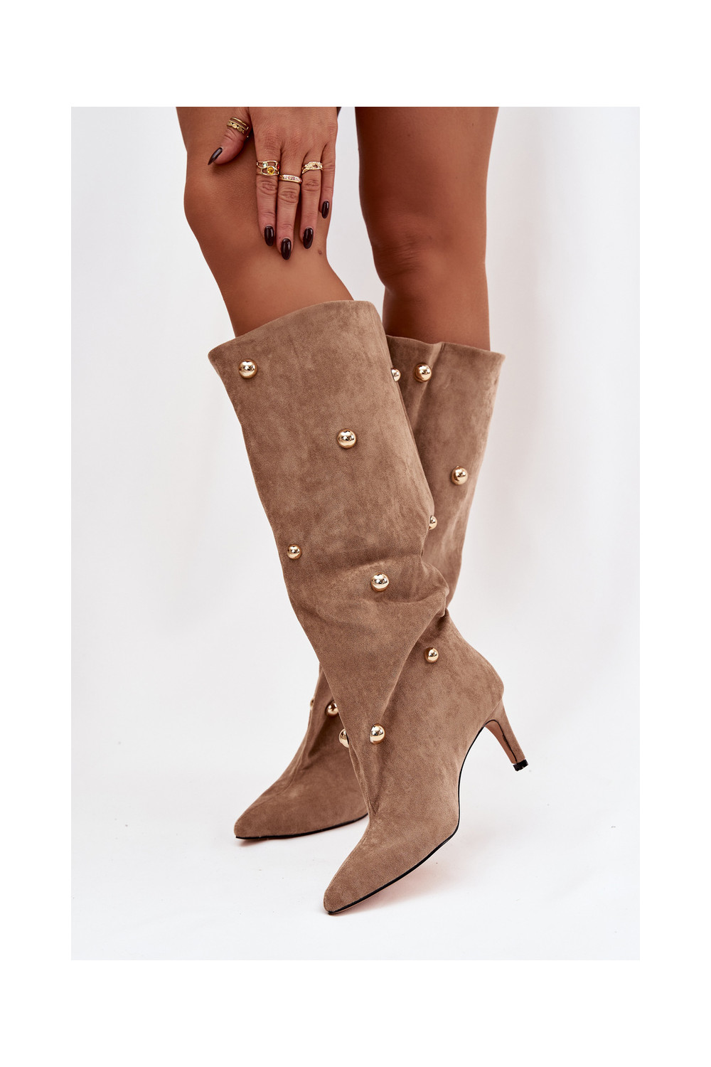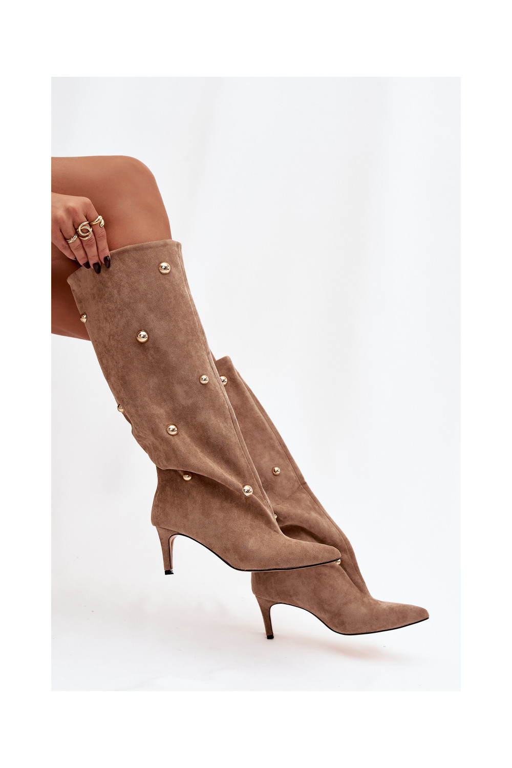 Slip-on vzor dámské dlouhé boty s tenkými podpatky Ze zlaté barvymi Ozdobami béžové Thaliane