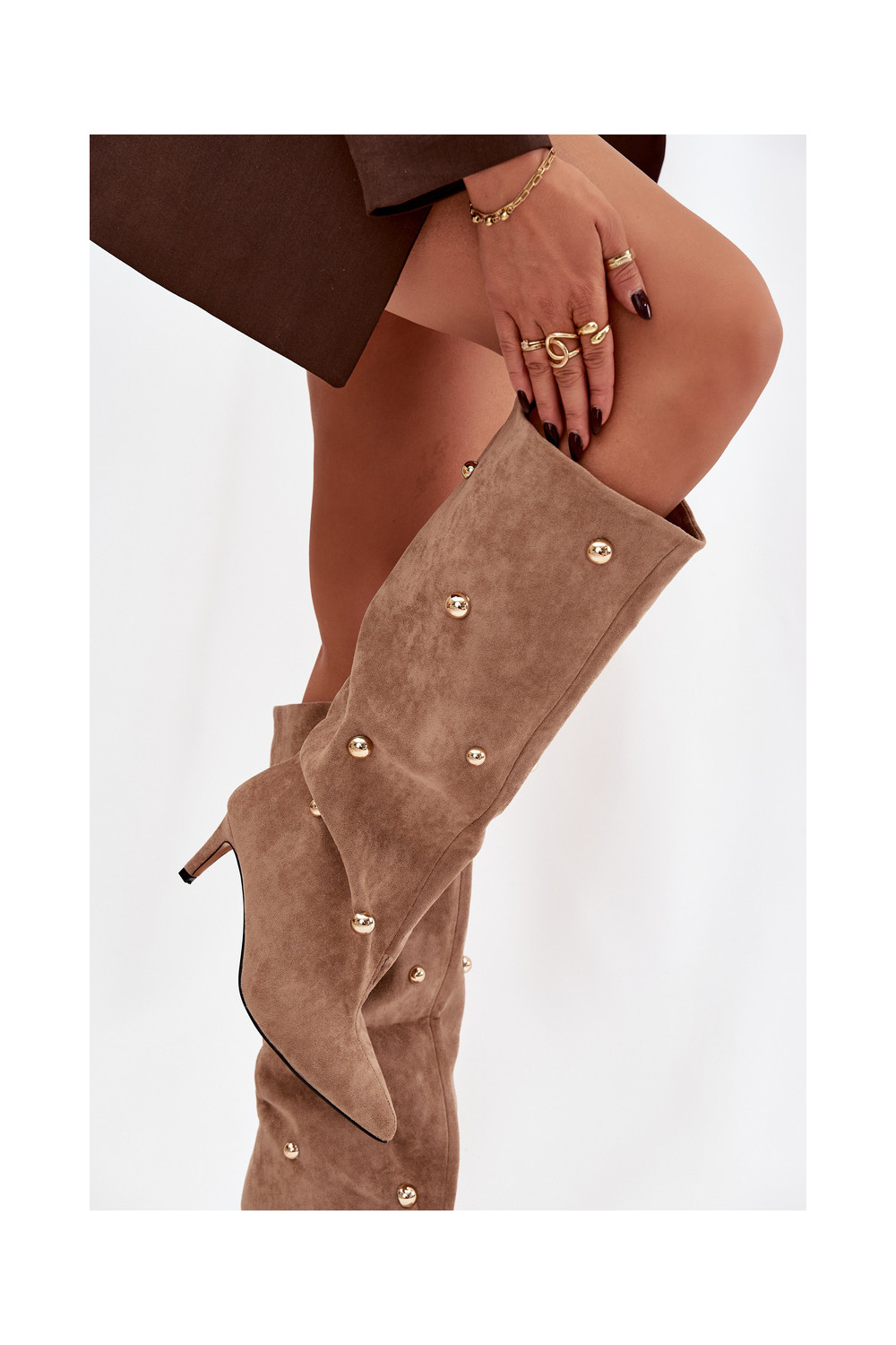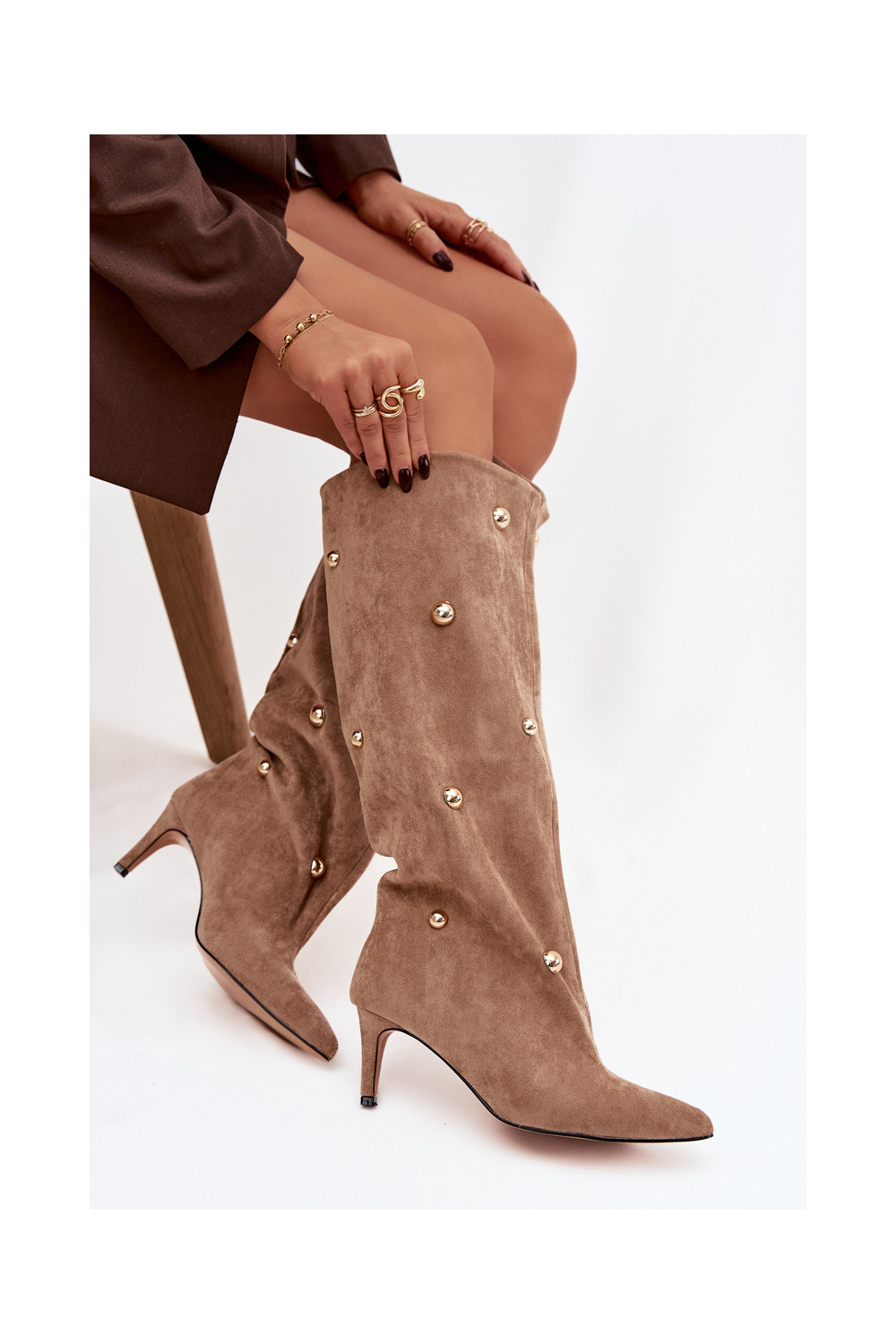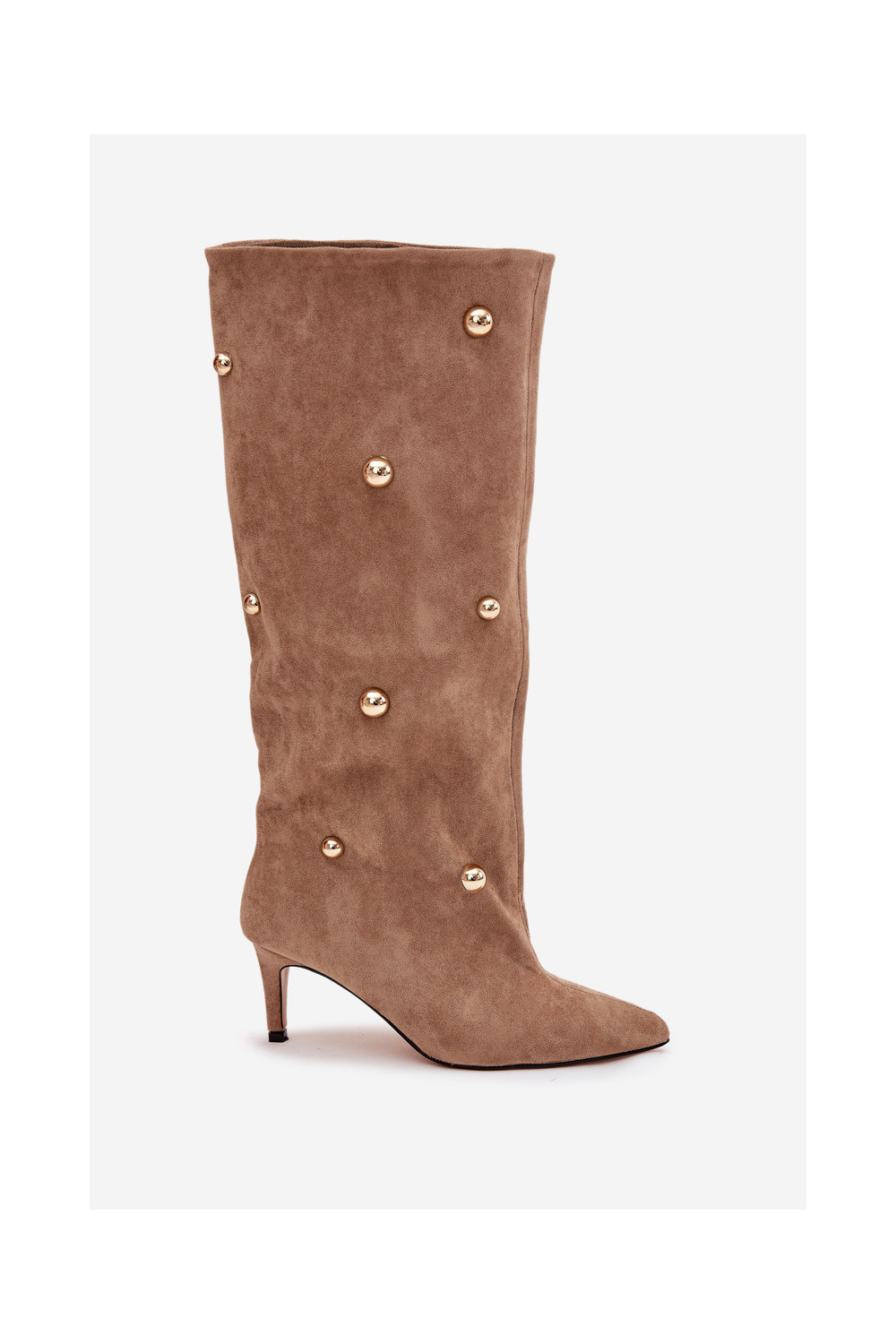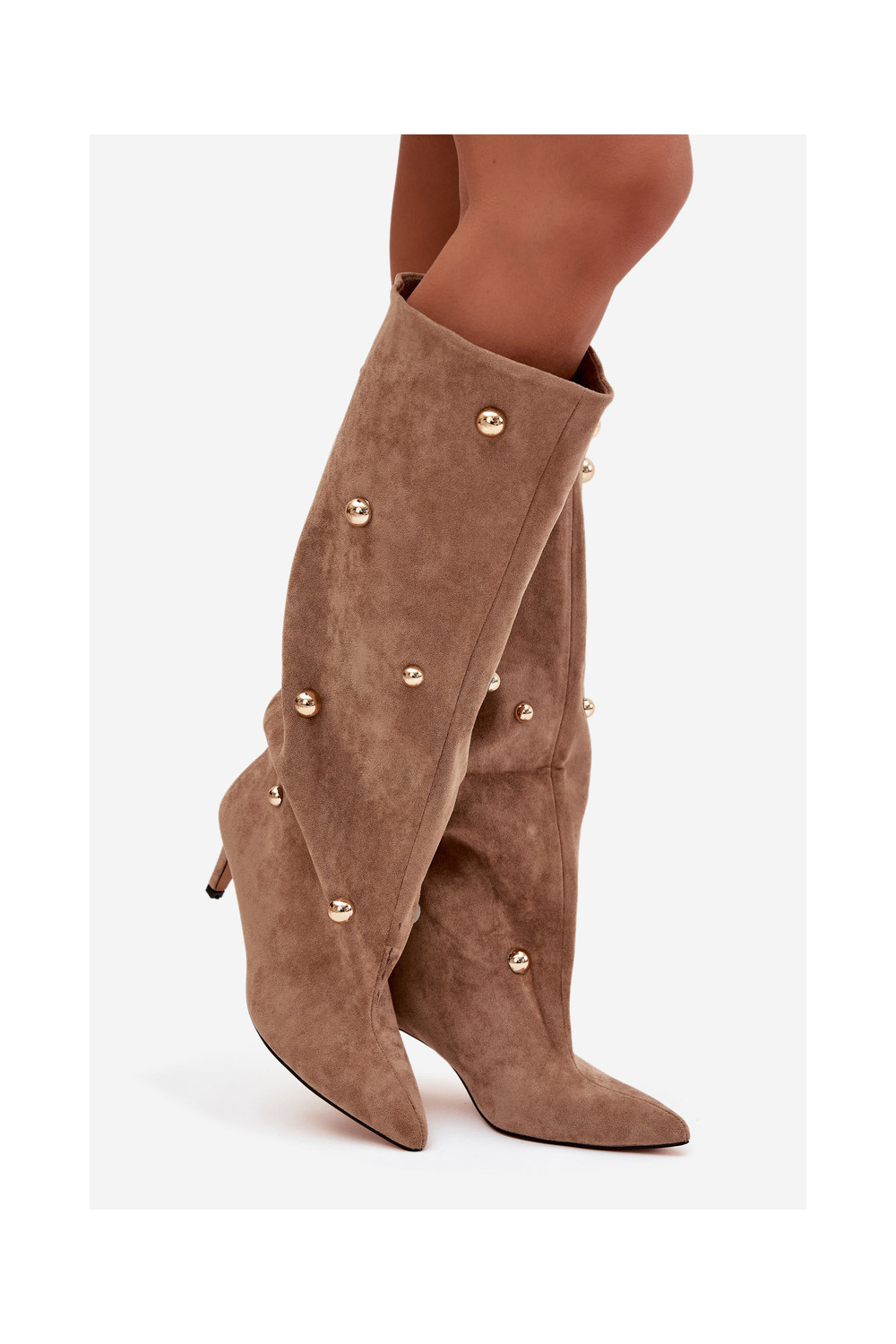 Slip-on vzor dámské dlouhé boty s tenkými podpatky Ze zlaté barvymi Ozdobami béžové Thaliane