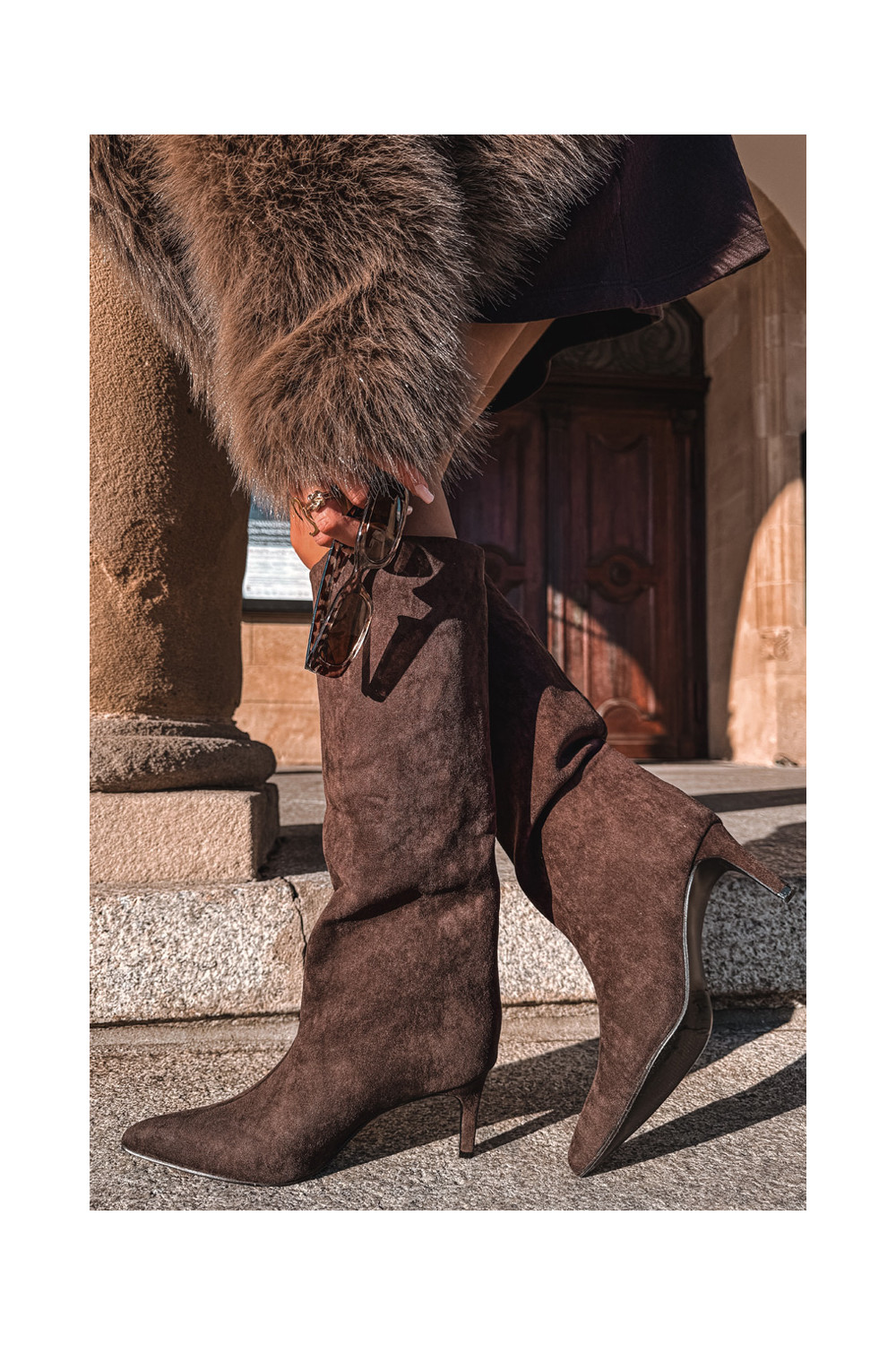 dámské dlouhé boty Z z eko semišeu Slip-on vzor s tenkými podpatky Czekoladowe Phelin