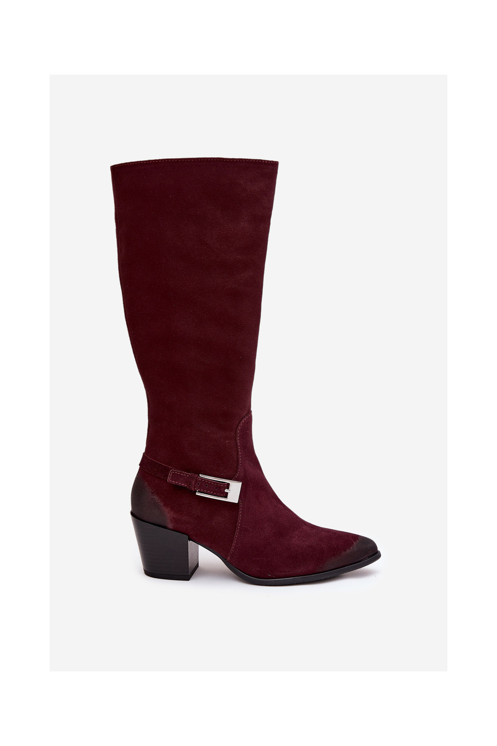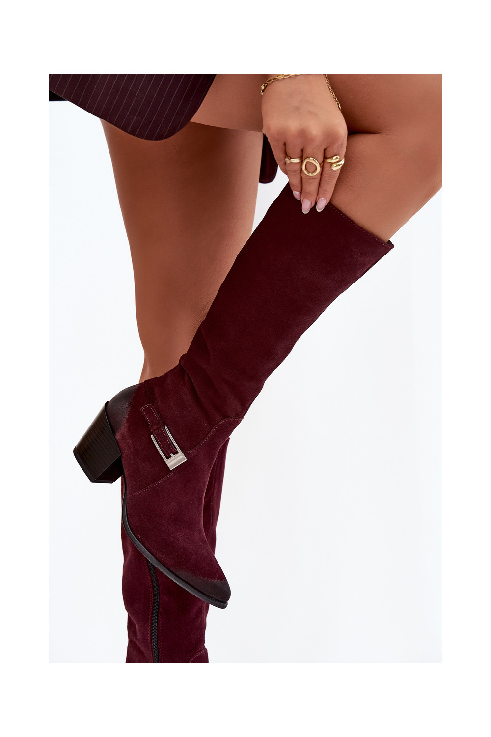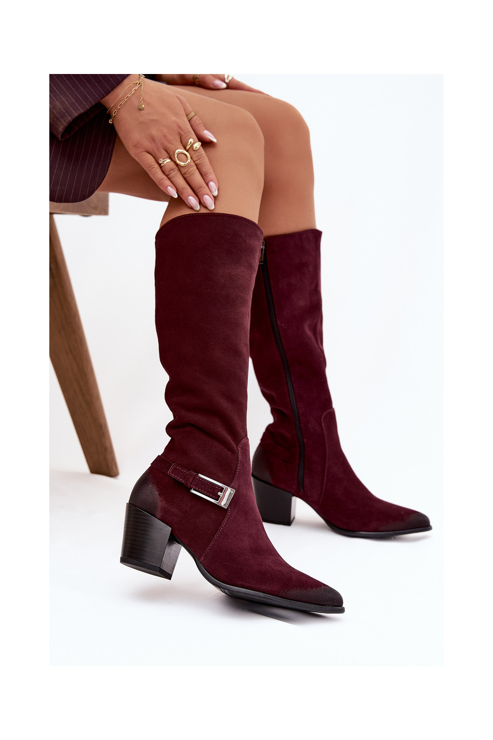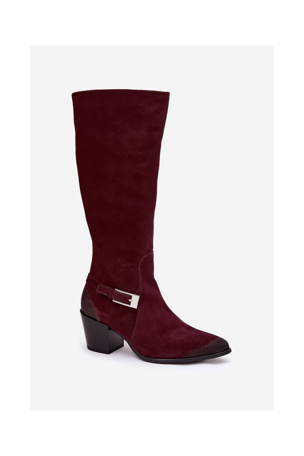 ze semiše dlouhé boty s podpatky s přezkami zateplené Zazoo 70156 vínová