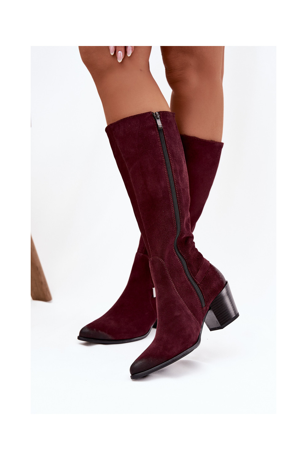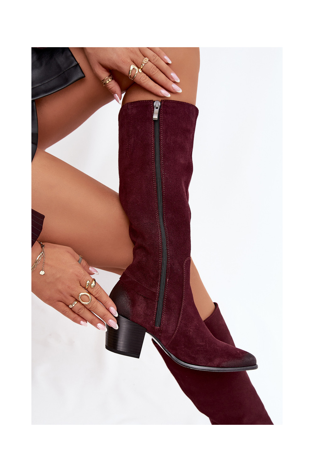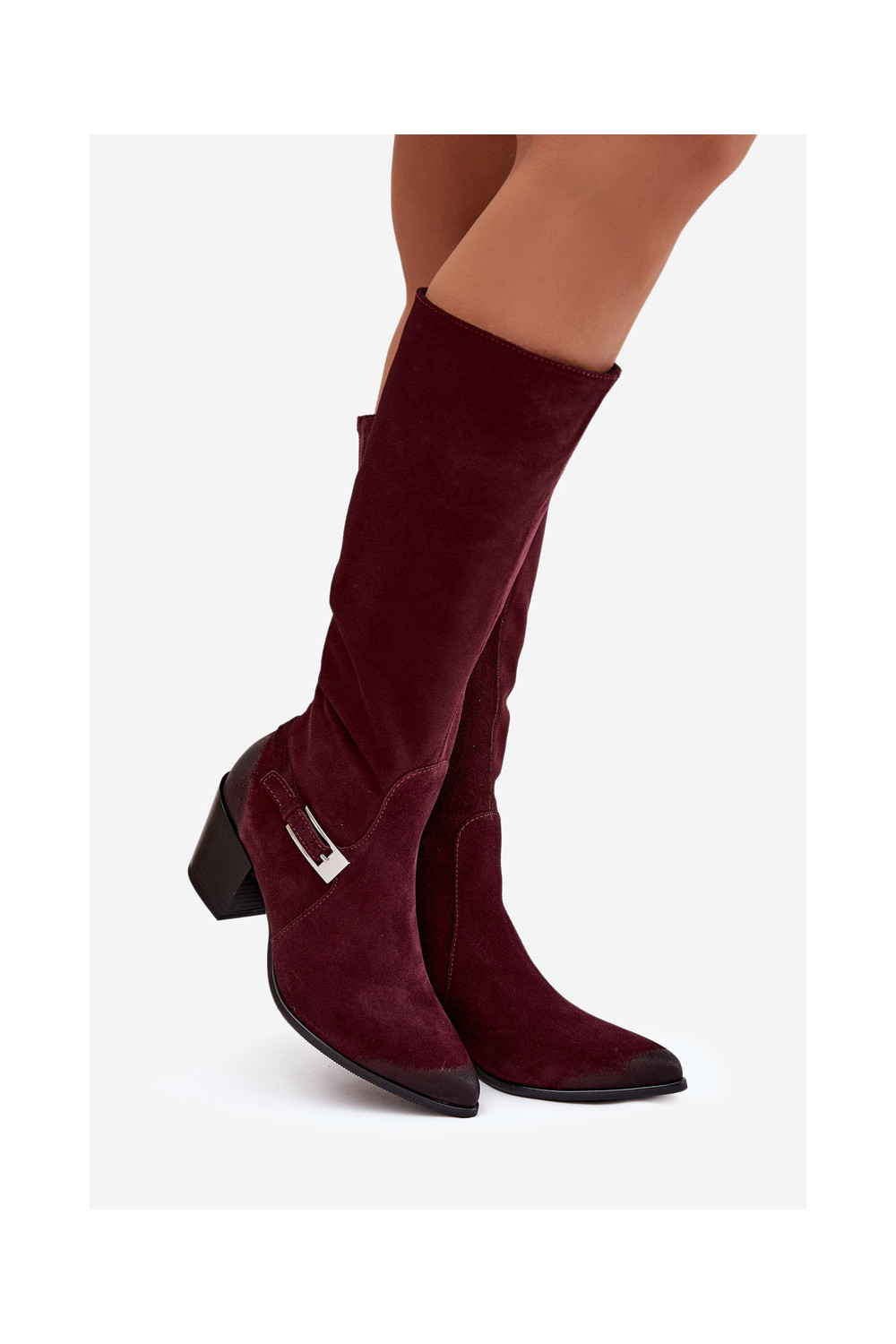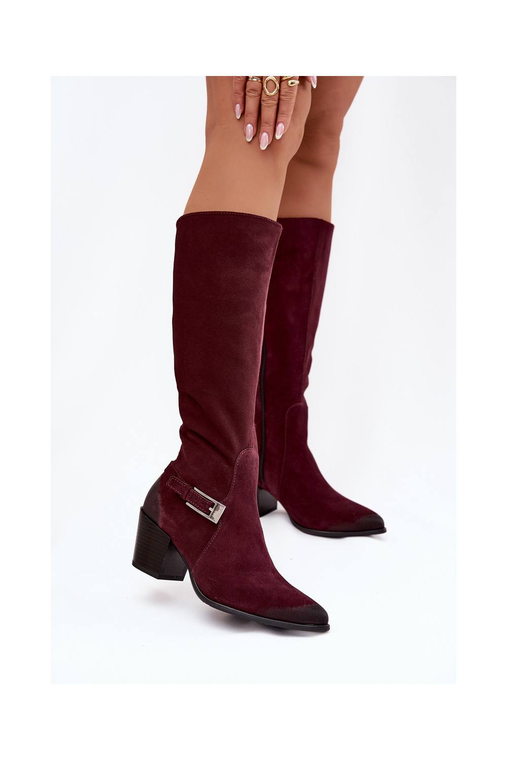 ze semiše dlouhé boty s podpatky s přezkami zateplené Zazoo 70156 vínová