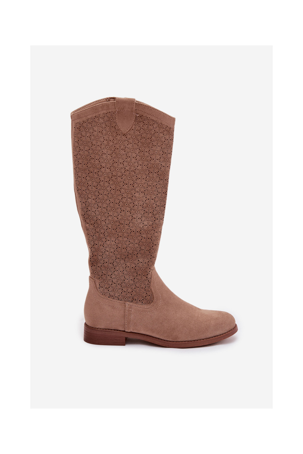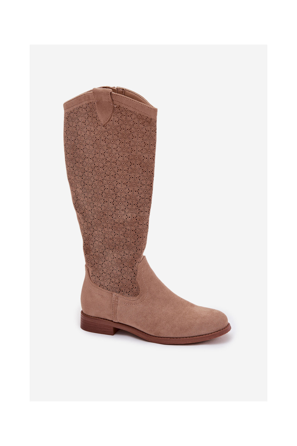 dámské dlouhé boty s ažurovými prvky s širokými podpatky S.Barski HY61-8022 béžové