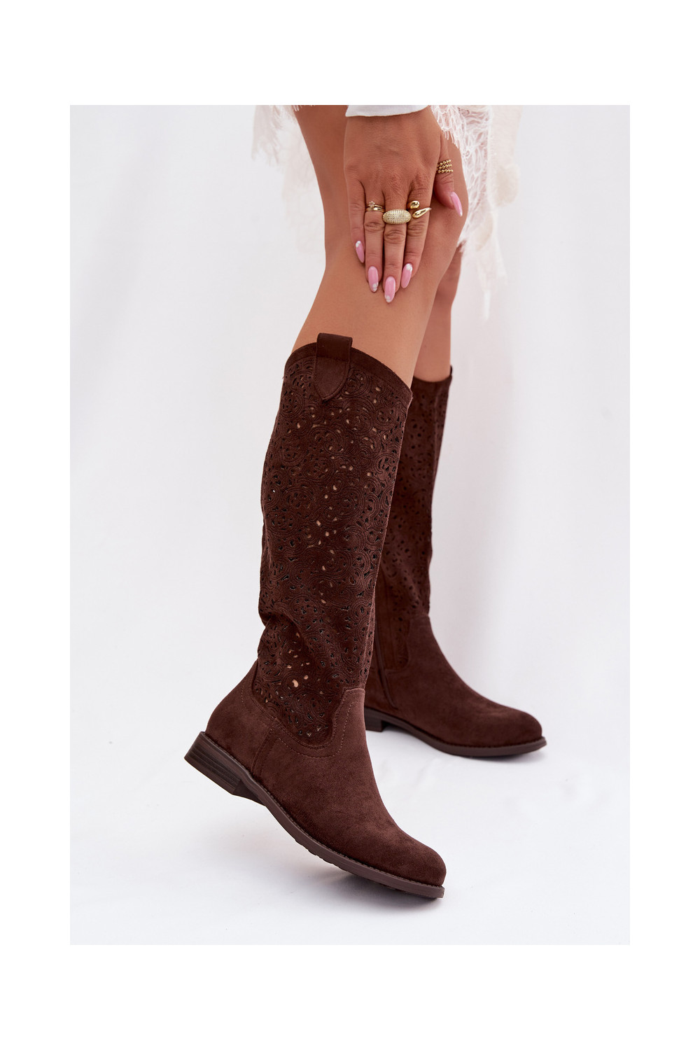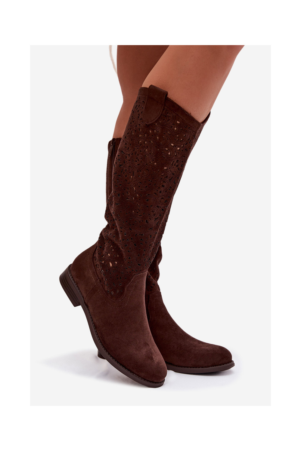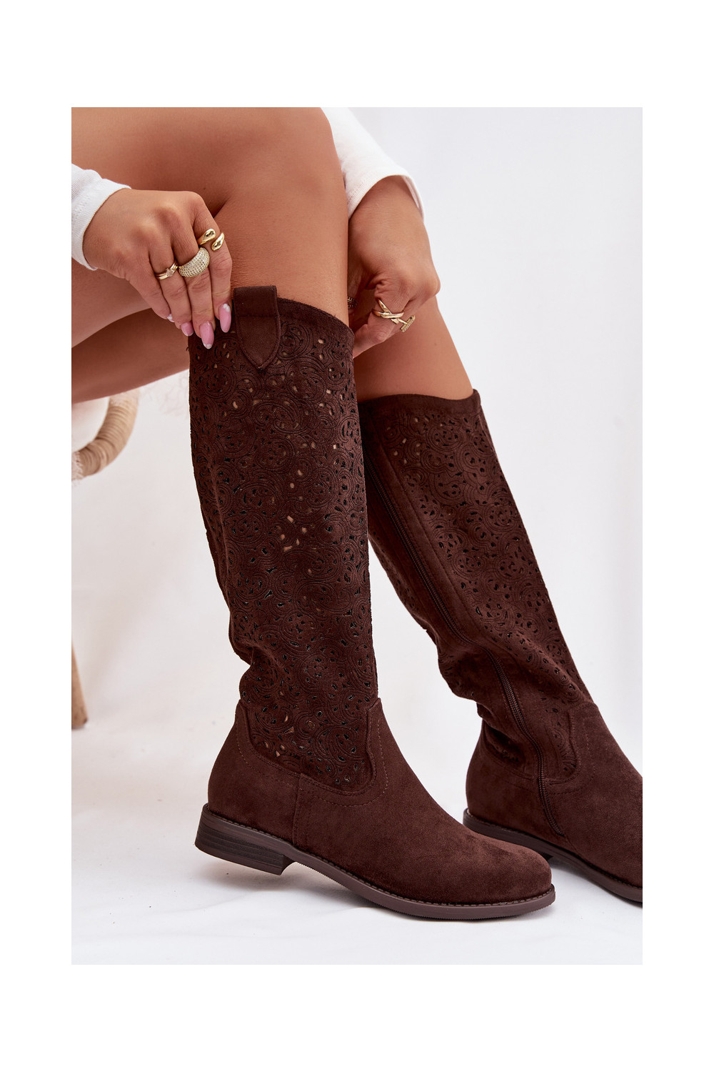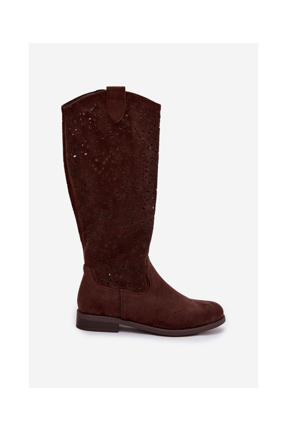 s ažurovými prvky dámské dlouhé boty s širokými podpatky S.Barski HY61-8023 Czekoladowe