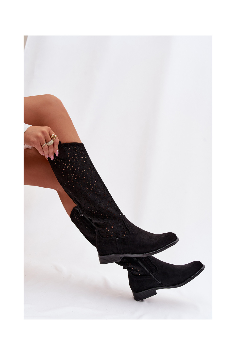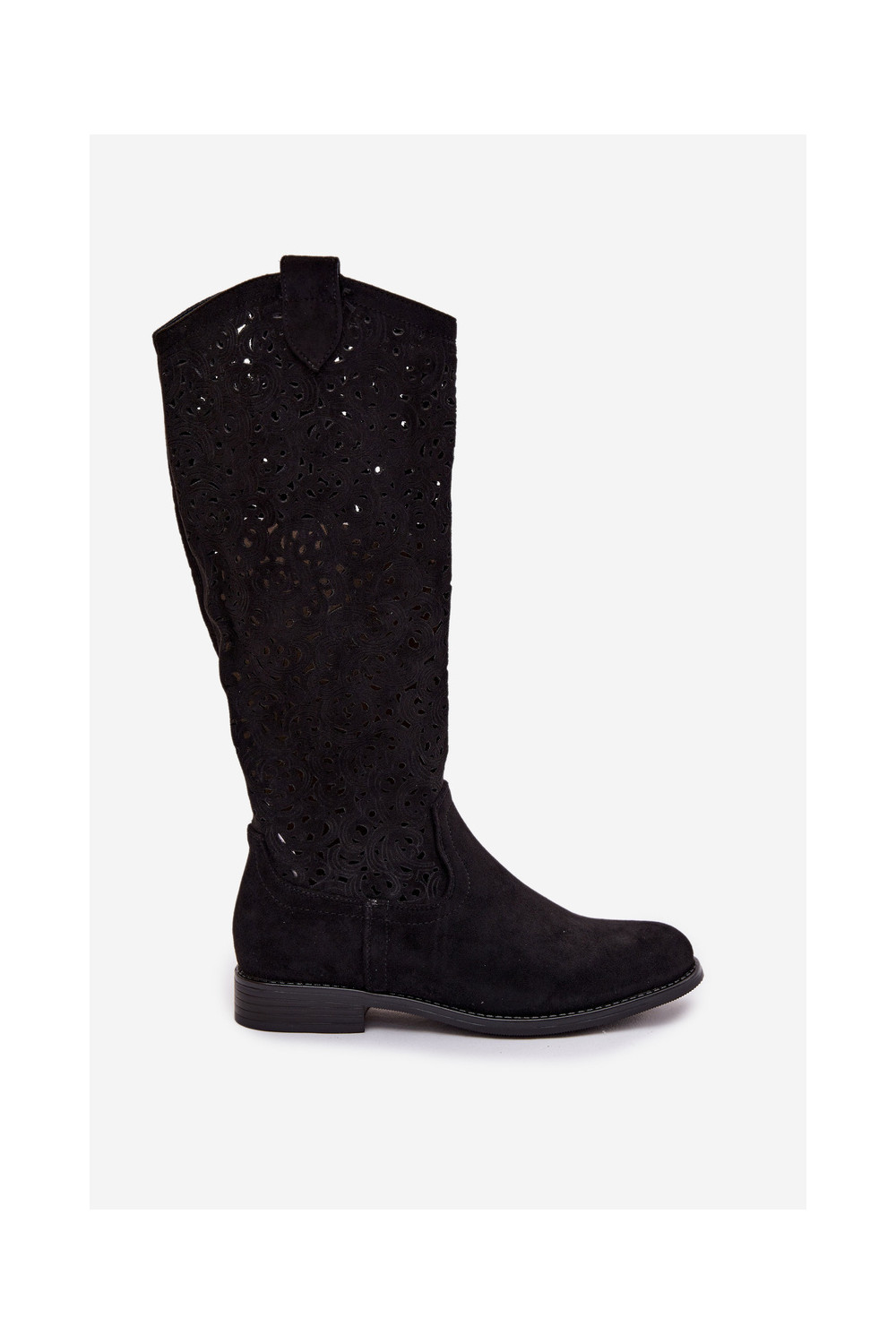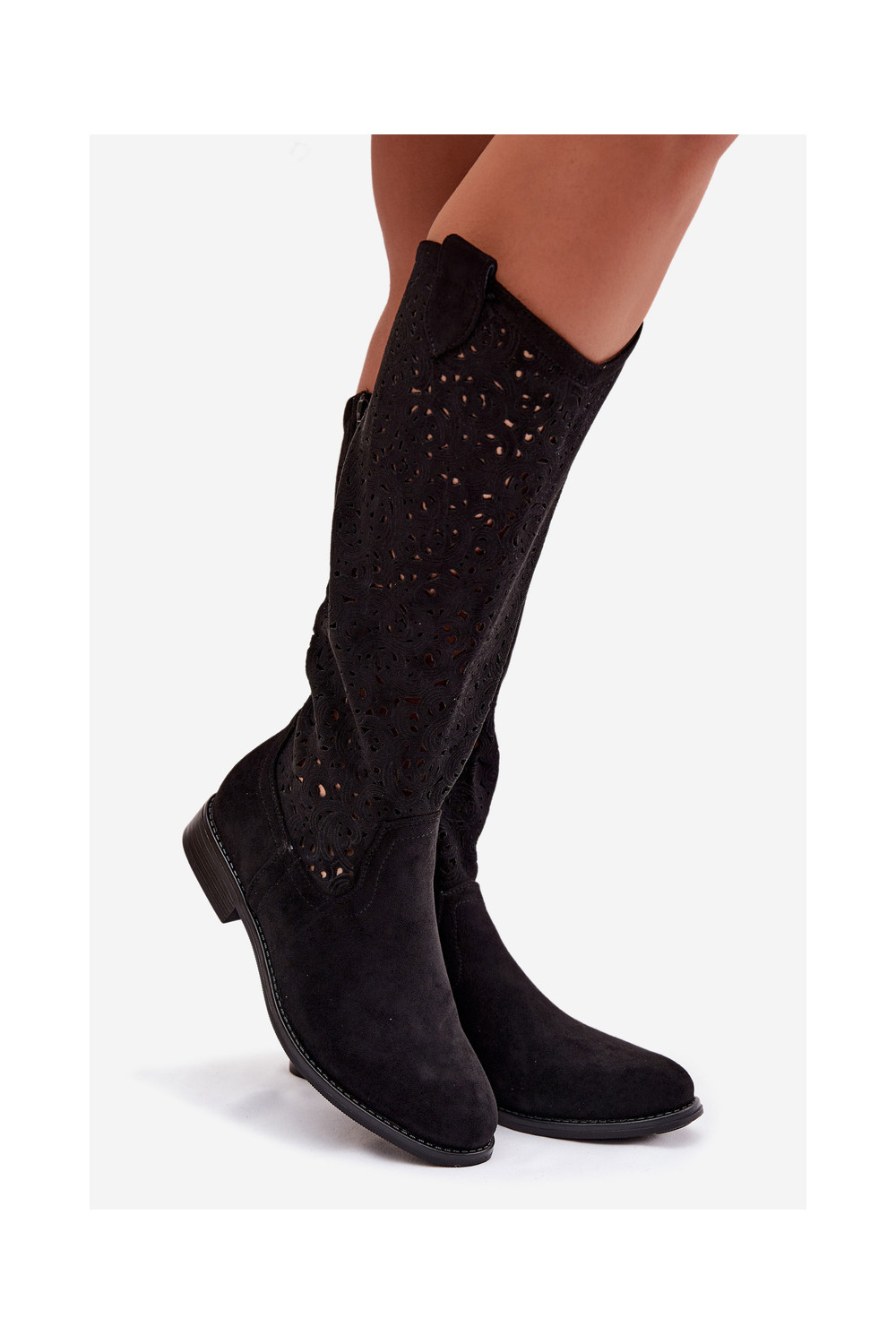 s ažurovými prvky dámské dlouhé boty s širokými podpatky S.Barski HY61-8023 Černé