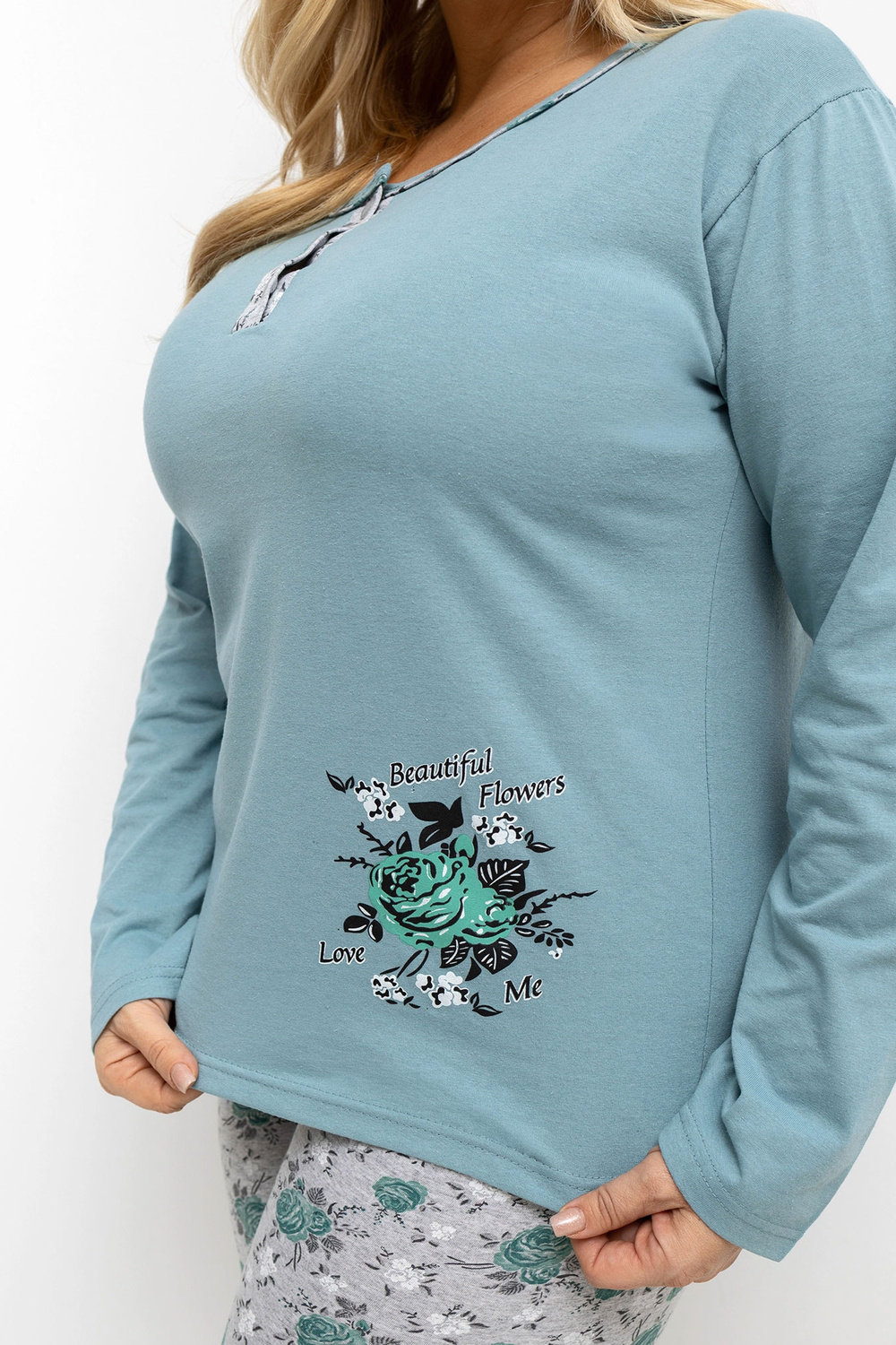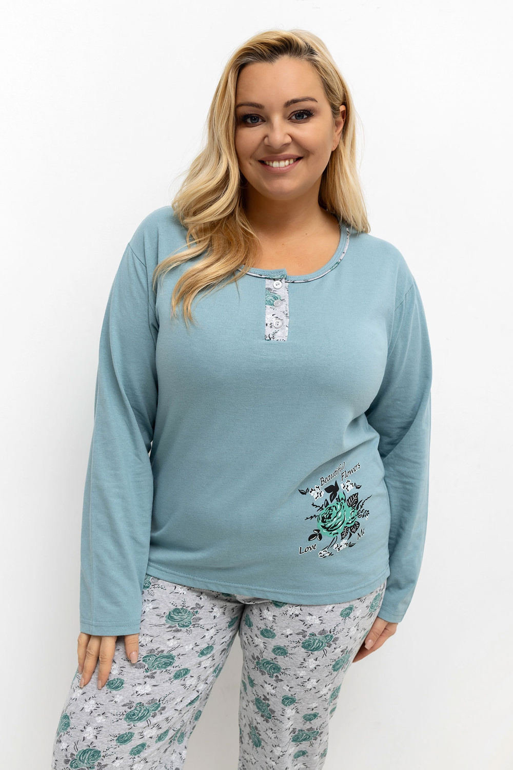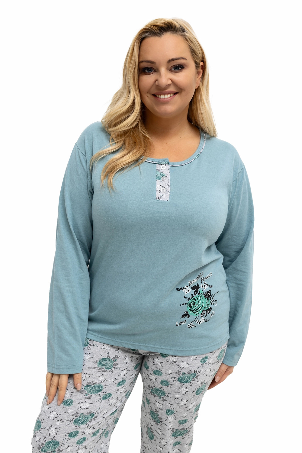 Rozměry pyžama ve velikosti XL, naměřené roztažené: halenka: šířka pod pažemi - 56 cm, délka rukávu - 58 cm, celková délka - 69 cm, šířka dole - 56 cm, kalhoty: šířka pasu - 29 cm (roztažené), šířka pasu - 62 cm (natažené), šířka boků - 57 cm, celková délka - 97 cm.
