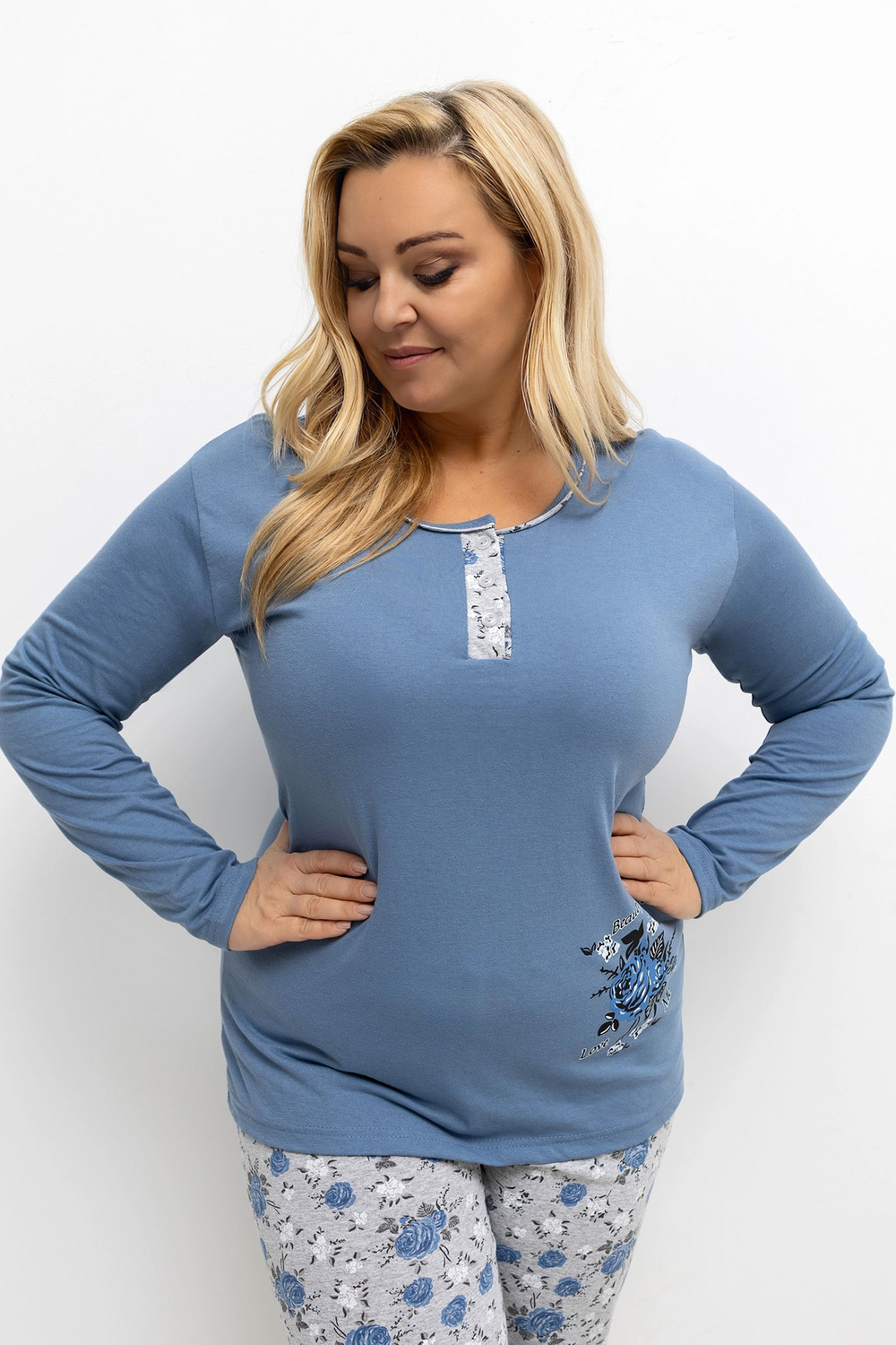 Rozměry pyžama ve velikosti XL, měřené na vyrovnaném kusu: halenka: šířka pod pažemi - 56 cm, délka rukávu - 58 cm, celková délka - 69 cm, šířka dole - 56 cm, kalhoty: šířka pasu - 29 cm (na rovno), natažená šířka pasu - 62 cm, šířka boků - 57 cm, celková délka - 97 cm.