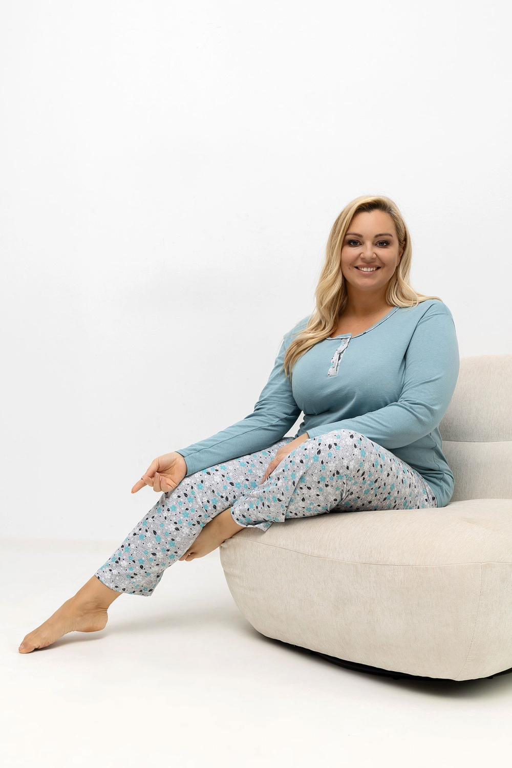 Rozměry pyžama ve velikosti XL, měřeno vleže: halenka: šířka pod pažemi - 56 cm, délka rukávu - 59 cm, celková délka - 69 cm, šířka dole - 56 cm, kalhoty: šířka pasu - 32 cm (vleže), šířka pasu - 68 cm (natažené), šířka boků - 56 cm, celková délka - 101 cm.