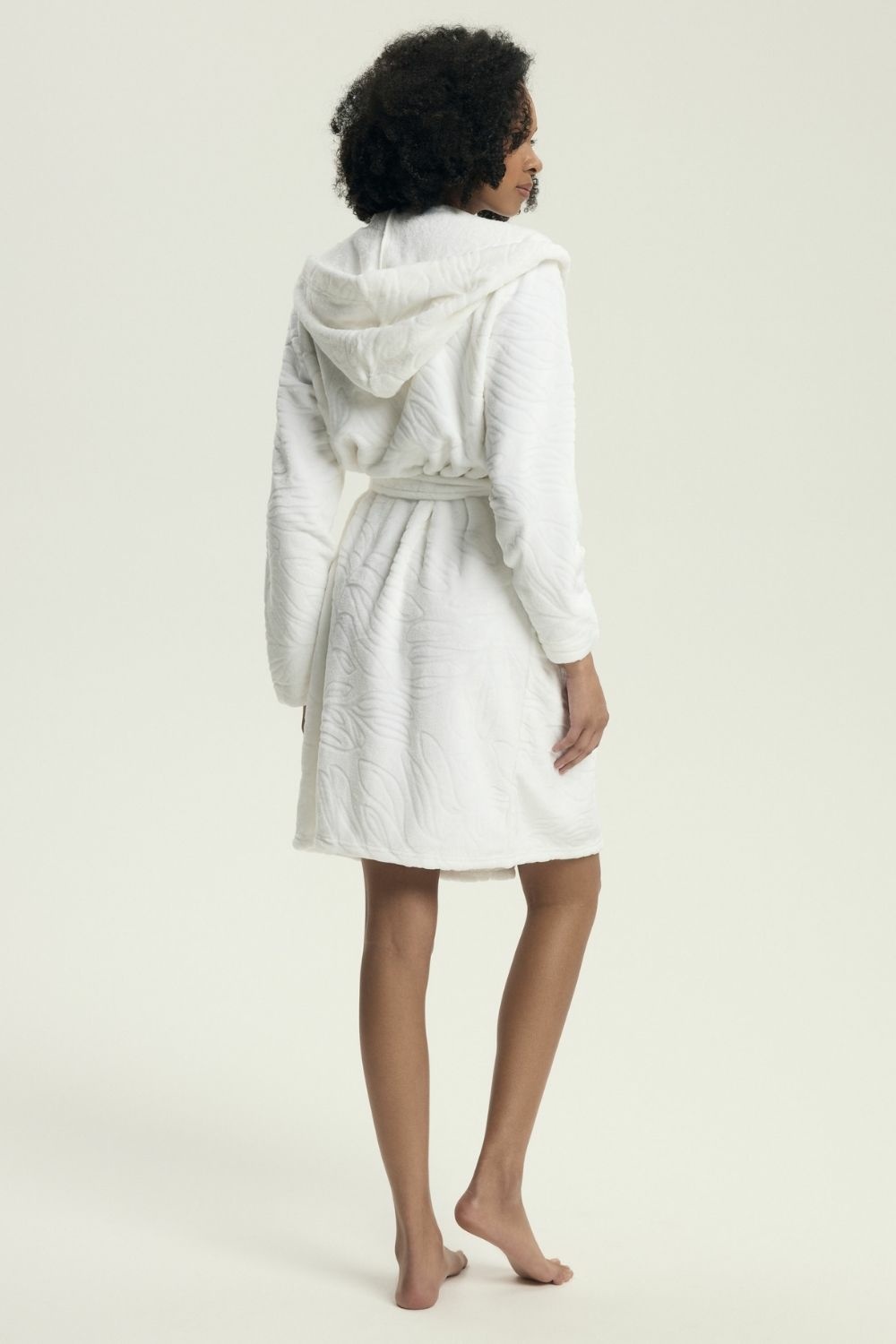 Soft and cozy women's bathrobe with a loose, comfortable cut, perfect for everyday use and as homewear. Made of Materiál: with an embossed pattern, which gives the whole an elegant and feminine look. The has a hood, practical pockets, and a waist tie, allowing you to adjust the bathrobe to your silhouette. The length above the knee ensures comfort and freedom of movement. The bathrobe is packed in a plastic bag, also excellent as a gift.