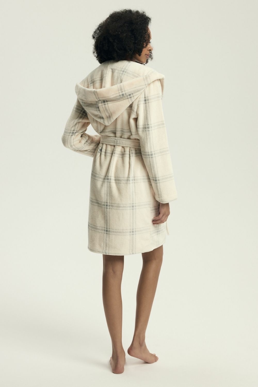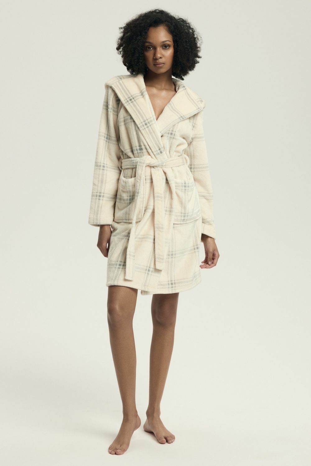 Cozy and stylish women's bathrobe with a loose, comfortable cut, made of soft material with a print that gives it a feminine character. The with a hood and practical pockets combines comfort with functionality. The knee-length ensures freedom of movement, and the belt tie allows for a perfect fit to the silhouette. The bathrobe is packed in a plastic bag, a great choice also as a gift.